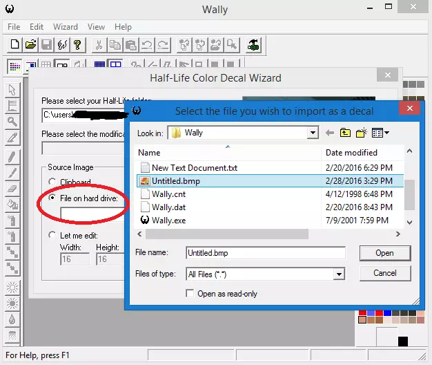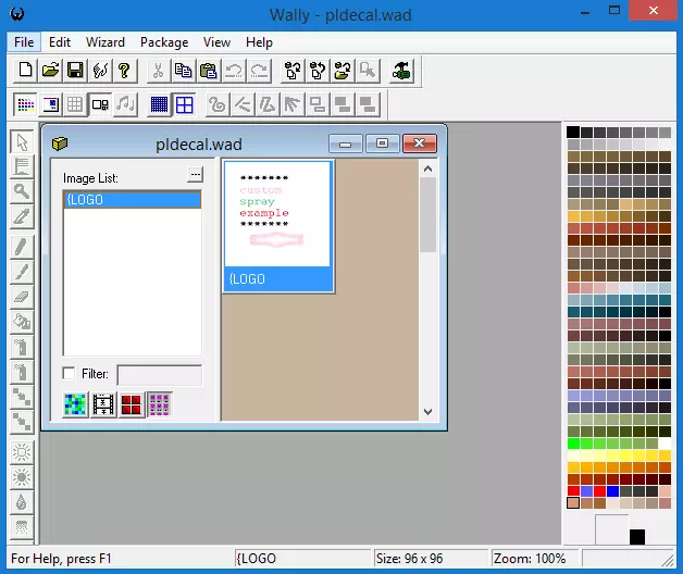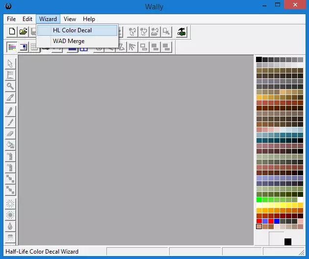 Wally作为喷图编辑器。 我发现Wally在制作喷图时效果最佳。你可以在网上找到Wally进行下载,但请记住,从网上加载软件时一定要小心。只从信誉良好的网站下载,并始终扫描文件以查找恶意软件、病毒、间谍软件以及所有其他形式的恶意软件和计算机有害程序。 已经警告过你了!你误下载恶意软件我可不负责! 启动Wally,然后转到“向导”工具栏,点击“HL彩色贴花”。
