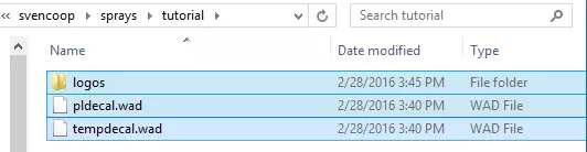 现在导航至你的【Svencoop】文件夹,它通常位于: C: Program Files (x86) Steam steamapps common Sven Co-op svencoop 如果你的CPU没有【Program Files (x86)】文件夹,一般在【Program Files】文件夹中查找即可。 我建议在【svencoop】文件夹内创建一个专门用于存放自定义喷漆的文件夹,现在就创建一个名为【sprays】的文件夹。在本教程中,我在【sprays】文件夹内创建了一个名为【tutorial】的子文件夹,你也可以创建一个同样名为【tutorial】的子文件夹。 将你的pldecal、tempdecal以及【your_sprays_name】.BMP文件复制粘贴到你创建的【tutorial】文件夹中。 在【tutorial】文件夹内创建一个名为【logos】的子文件夹,并将你之前创建的【your_sprays_name】.BMP文件放入该文件夹中。