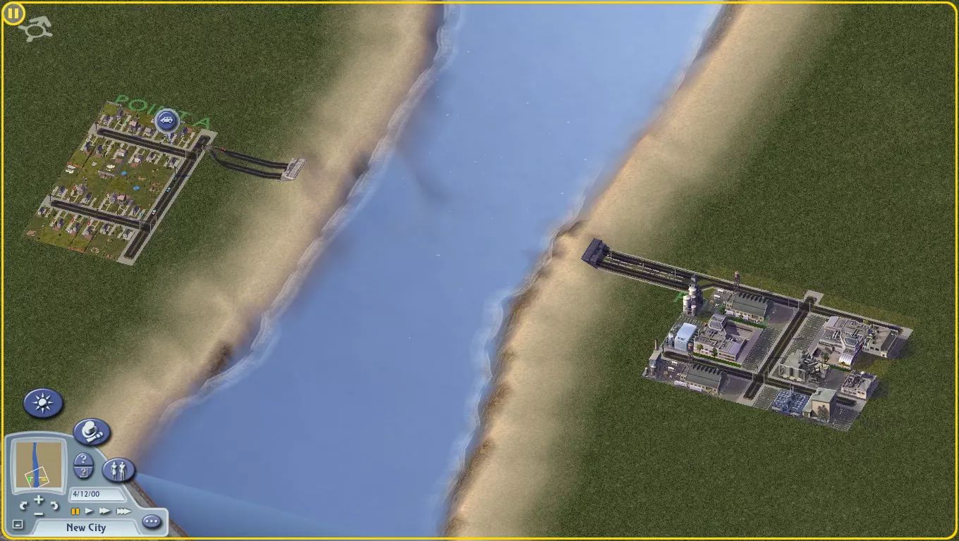 我将逐步教你在《模拟城市4 豪华版》中建造水下隧道。这包括各种街道、大道、高速公路和铁路的水下隧道建造方法。 第一部分 需要连接A点和B点吗?不想建造或没有空间建造丑陋的桥梁?为什么不尝试建造水下隧道呢? 首先,确保A点和B点位于同一网格空间,就像建造桥梁时那样。 接下来,将两地的地面平整。