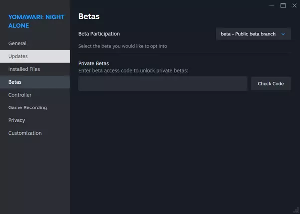游戏本身是非常优秀的恐怖解密冒险游戏,然而移植方面却存在诸多问题,导致许多人无法顺利游玩,本指南希望能提供些许帮助 前言 看了一下国内基本没有【夜廻】运行问题的讨论帖子,然而steam版本下各国关于游戏打开后闪退的问题反馈非常多,解决方式也十分繁杂,所以用中文做个总结贴,希望能帮到英文苦手又想体验此游戏的玩家。 关于游戏内存档闪退问题可以看指南中wesw的一篇帖子 信息来源 用户:NISAAlex 帖子发表日期2016-2017 用户:fried-chicken帖子发表日期:2025 主要解决方案总结 1. 参加游戏的Beta版本 Beta版可以帮助玩家绕过当前版本的错误或兼容性问题。 操作步骤如下: 1. 打开Steam游戏库; 2. 右键点击游戏《夜廻》,选择“属性”; 3. 进入“Betas”选项卡; 4. 从下拉菜单中选择Beta; 5. Steam会自动下载并安装。