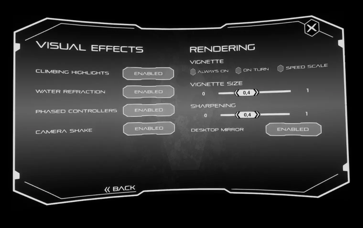 攀爬高亮:开启或关闭蓝色攀爬辅助标记,该标记用于显示可攀爬的物体。 水面折射:开启或关闭水下发生的扭曲和变形效果。 控制器相位显示:当虚拟手部与环境发生碰撞时,显示控制器的实际位置。 相机抖动:禁用所有相机抖动效果,有助于缓解晕动症。 渐晕效果:根据所选设置在屏幕周围添加渐晕效果,该效果有助于减少游戏时的晕动症。【开启转动】选项会在使用摇杆旋转时应用渐晕效果;【速度缩放】选项会应用渐晕效果,并根据移动和下落速度调整其强度;【始终开启】选项会一直应用渐晕效果。暗角大小:此选项会影响暗角效果的强度。 锐化:该功能可锐化图像,使其看起来更加清晰。 桌面镜像:可设置为【启用】或【禁用】。启用时,游戏画面将同时显示在电脑屏幕和VR头显上;禁用时,电脑屏幕将显示黑屏。 语言