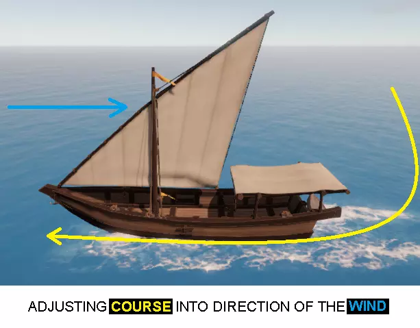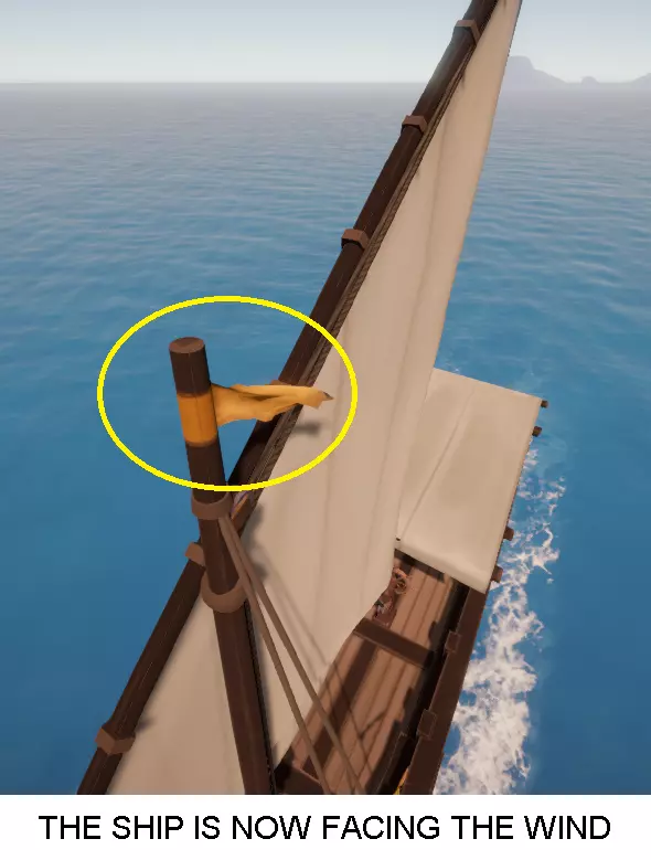 本指南将介绍三角帆船的倒车能力 操作说明 倒车是横帆船固有的能力。但经过适当准备和了解相关知识后,三角帆船也能实现倒车。 这在船只因失去转向动力而完全停在逆风区域、且无法通过收紧缭绳调整船帆时,对于摆脱困境非常有用。此外,在公海航行前或航行中,也可利用倒车帮助船只调整至合适的锚泊方向,以面对海浪。此外,如果在停靠过程中出现计算失误,导致船只驶过目标停靠点,需要小幅倒车而不必完全掉头时,这种操作能节省大量时间。 注:斜体字的含义可在本指南底部的【航海术语小词汇表】中查询。 步骤1:调整位置 此操作的第一步是让船只面朝来风方向。如果船只已失去动力且正对着风,可跳过此步骤。 使用方向盘调整舵叶,利用前进动力使船只转向迎风方向。