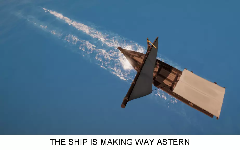 在此位置,你所面朝的方向将是帆桁尝试摆动的方向。注意,如果你站在桅杆前方(相对于船首而言),帆桁的操控方向会反转。面朝右舷正横方向,通过绞紧帆桁使其转至正横位置。若未成功,尝试通过绞紧或松开帆索绞盘来调整帆索。如果所有步骤操作正确,船帆将开始兜住顶头风,你的船也会开始向后退。