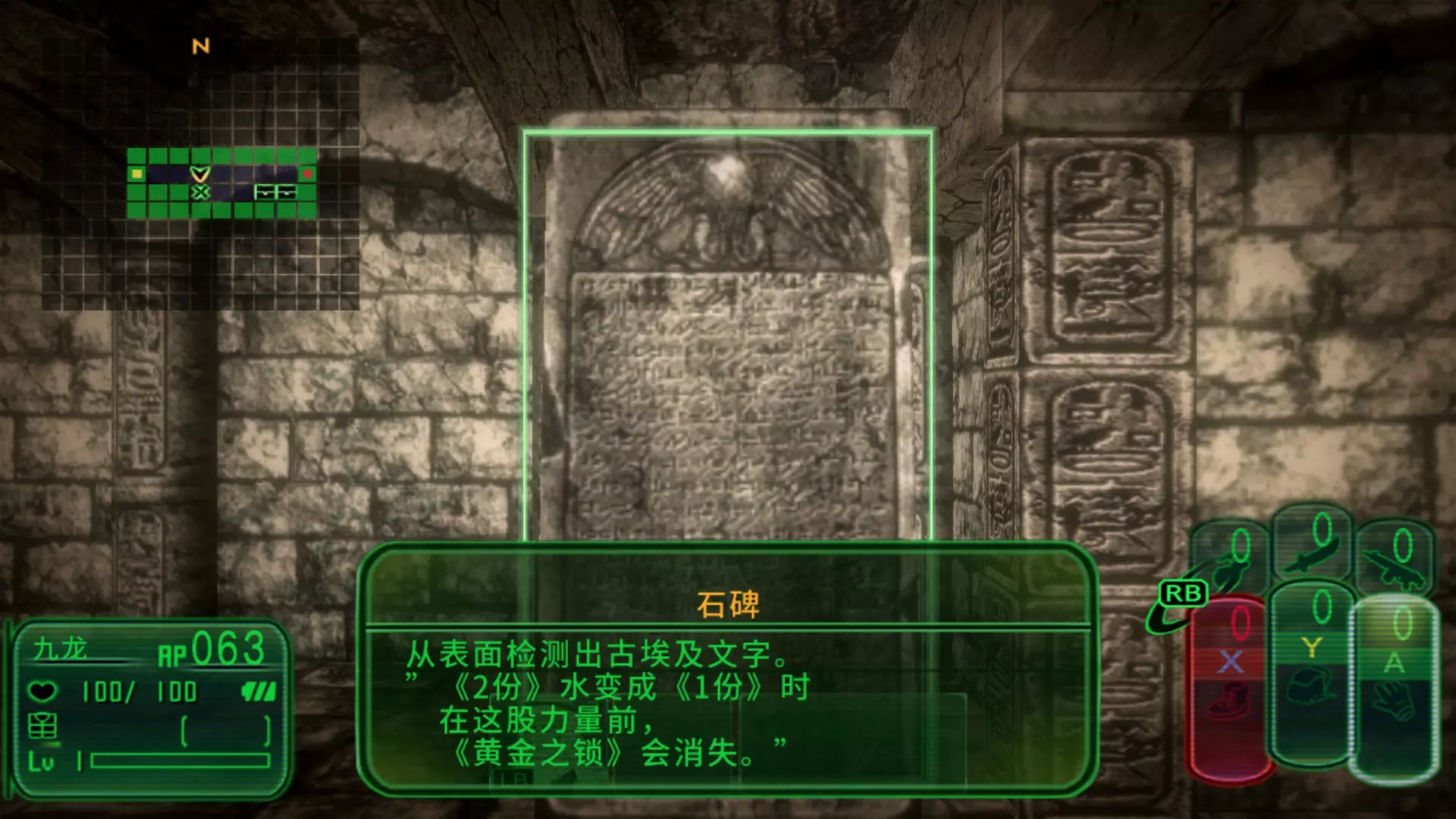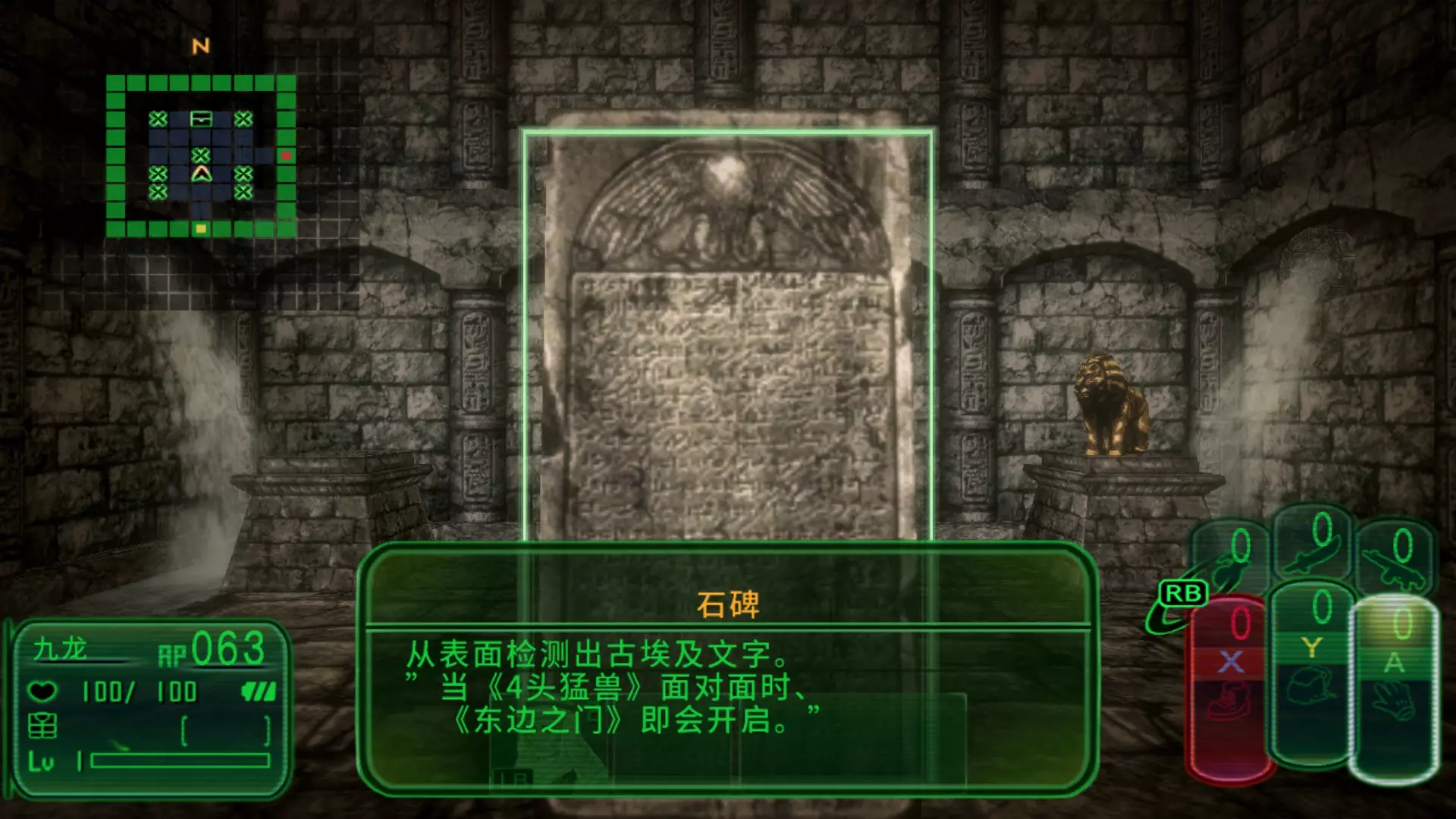 在游戏开始之前 如何修改游戏语言?游戏的语言设定取决于玩家Steam客户端界面语言的设定,具体可以在游戏根目录下UserConfigFile.ini文件中查看,Language中1表示英语,2表示简中,3表示繁中,4表示日语。理论上可以通过直接修改这个配置文件来直接修改,但是这个游戏似乎无法直接运行,必须通过启动器来运行,而启动器在启动游戏时都会把配置文件修改回来。在修改配置文件后设置配置文件仅可读会导致启动器运行报错,所以目前只能通过修改Steam客户端界面语言来修改,稍微有点麻烦。 感谢Bocch1的提醒,可以在启动项里添加<path-to-game> Kowloon_Game。通过exe %command% 直接启动游戏主程序可跳过启动器,这样修改配置文件就能起效。 顺便吐槽一句,这游戏启动器里的中文拼写有误,显示为Simplified Chainese。 游戏提供简单、普通、困难三种难度选择,且难度可在游戏中随时自行修改。 若想达成全成就,其中【Death Mask of Pakal the Great】成就要求在困难模式下打败依波礼·伊邪那美。 目前尚不清楚若初始选择其他难度,在挑战该 boss 前将难度改为困难是否能解锁此成就。从成就字面意思推测或许可行,但我目前正以困难难度进行游戏,会在挑战该 boss 前先调低难度,之后再改回困难模式测试能否解锁该成就。根据PC游戏维基,《九龙高校编年史》的启动分辨率支持1280x720、1600x900和1920x1080,但我这里的启动分辨率只能选择1280x720。目前只能在UserConfigFile.ini里自行修改参数,然后在启动项里通过直接启动游戏主程序Kowloon_Game.exe来跳过启动器。攻略参考主要会参考以下两个攻略网站。就我实际的游玩测试来看,spwiki的攻略在任务对话选项方面比h1g更加详实可靠,在h1g中所有的选项都是1个答案,但是根据我实际的测试来看,spwiki的多个选项基本都是可靠的,故而在攻略中会尽量采用spwiki的攻略,在二者答案完全不同时会单独进行标注,当然二者都是玩家实际游玩的经验总结,肯定也不是非常完满的,但是一定够用。 序幕 在序幕中,可以解锁4个成就,分别是Piri Reis map、Lake Winnipesaukee mystery stone、Dorchester Pot、Baghdad Battery。 希拉克莱奥神殿 游戏一开始玩家会出现在希拉克莱奥神殿,这个房间可以安逸地看教程学习游戏的基本操作,学习完就可以直接去北边大门,来到狮子厅。狮子厅(解锁两个成就)读取狮子厅中央的石碑可以获得谜题: