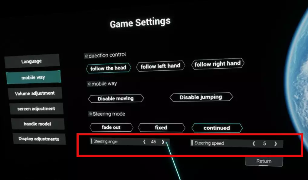 让你拥有最佳的VR游戏体验。 平滑转向 控制各个方向的旋转角度和速度。 可根据自身行为习惯进行设置。 转向角度和转向速度推荐设置 转向角度:45 转向速度:5