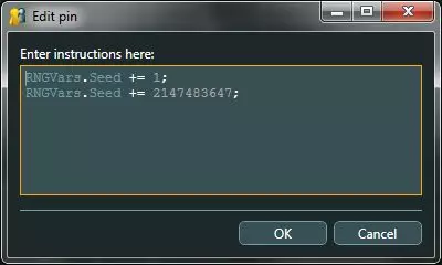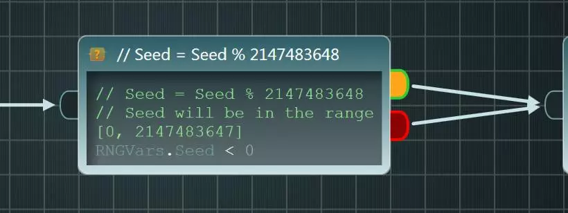 双击绿色输出引脚,在弹出的窗口中输入以下代码: RNGVars.Seed += 1; RNGVars.Seed += 2147483647;