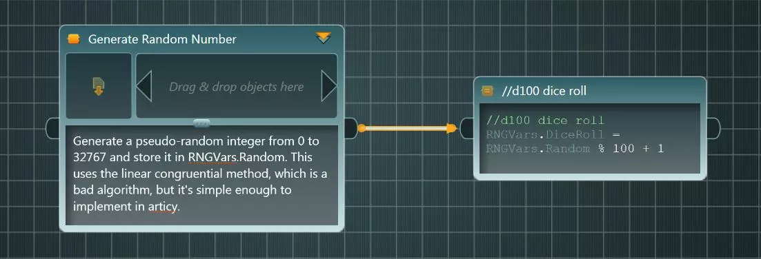 完成后点击确定。 最后,将此条件的两个出站引脚连接到父节点的出站引脚。 你可能会想,这到底是怎么回事?最后的指令和条件是为了在articy中实现以下代码,前提是articy支持位运算: RNGVars.Random = (RNGVars.Seed >> 15) & 32767 可惜的是,articy中没有位运算,所以我们不得不多费些周折来解决这个限制。 到这里,给自己鼓鼓掌吧。你现在在articy中拥有了自己的随机数生成器。太棒了。 伪骰子掷出 我们刚刚创建的随机数生成器将生成一个0到32767之间的伪随机数。你正在设计的游戏可能需要不同范围的随机数,例如d100需要1到100,或者d6需要1到6。你可以通过以下运算将伪随机数转换到不同的数字范围:RNGVars.DiceRoll = RNGVars.Random % RANGE + LOWER_LIMIT。RANGE 应是一个代表你所需随机数范围的数字,LOWER_LIMIT 是该范围的最低值。下图展示了如何实现一个 d100 骰子投掷。