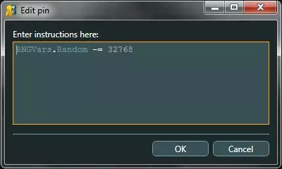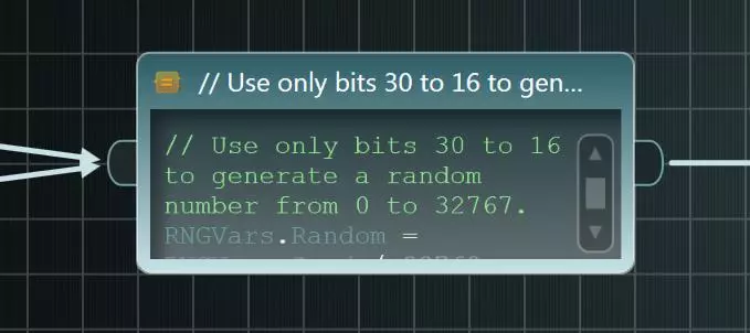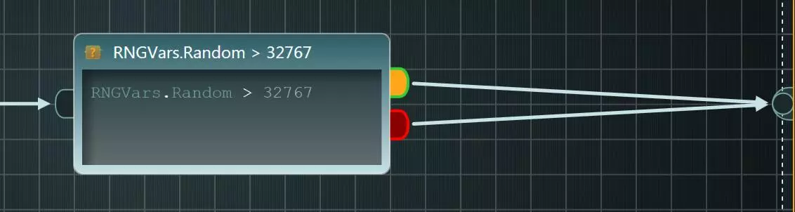 上图展示了最后一个条件的外观。注意其绿色输出引脚已点亮,表明其中嵌入了代码。双击绿色输出引脚,在弹出的窗口中输入以下脚本:RNGVars.Random -= 32768