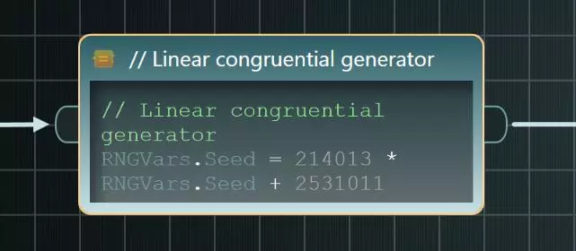 创建指令并将父节点的入站引脚连接到此指令的入站引脚。在其中编写以下代码: // 线性同余生成器 RNGVars.Seed = 214013 * RNGVars.Seed + 2531011 接下来,创建一个新条件并将指令的出站引脚连接到该条件的入站引脚。在其中编写以下代码: // Seed = Seed % 2147483648 // Seed 的范围将是 [0, 2147483647] RNGVars.Seed < 0 如以下图片所示,此条件的绿色输出引脚嵌入了脚本。