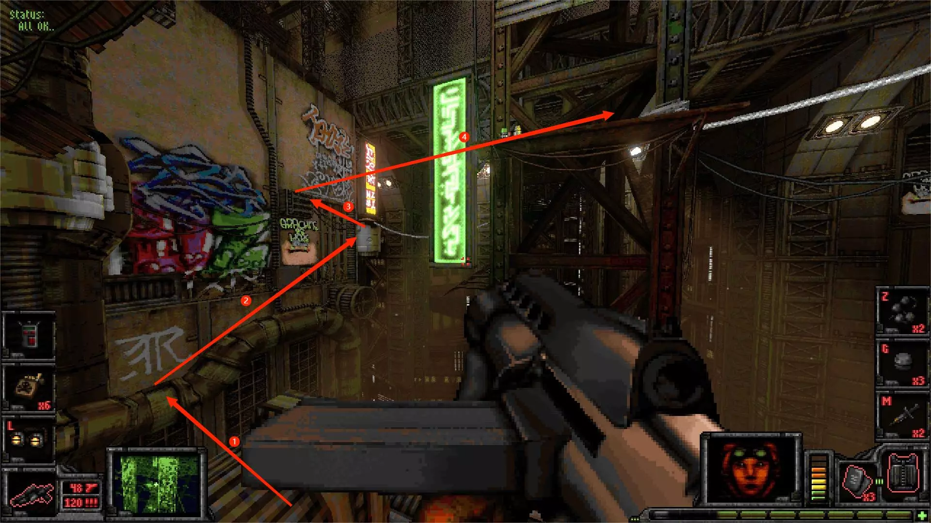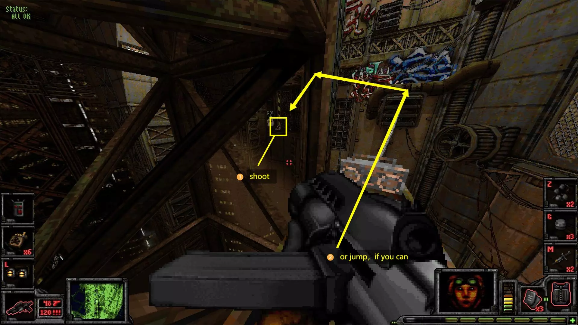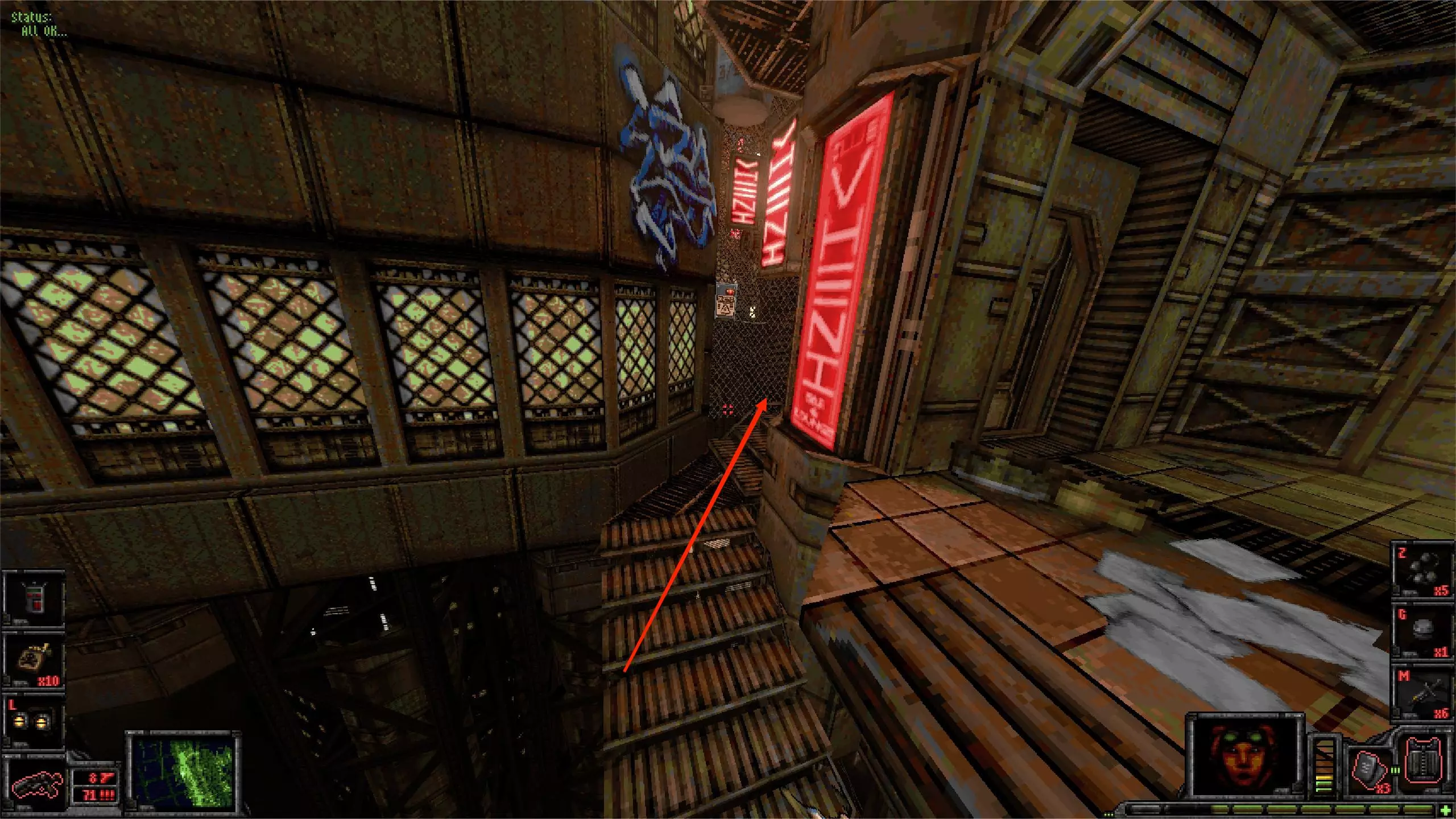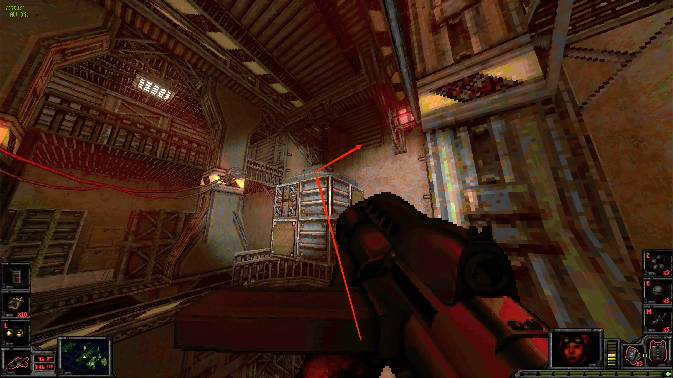 外部区域A [5/11] 楼梯 在此处你会受到飞艇的攻击。从缝隙向外看,它在最右侧。跟着箭头指示就能找到它。 你可以直接向其射击,如果你擅长跑酷,也可以从它上方直接过去。那里有一些补给品。