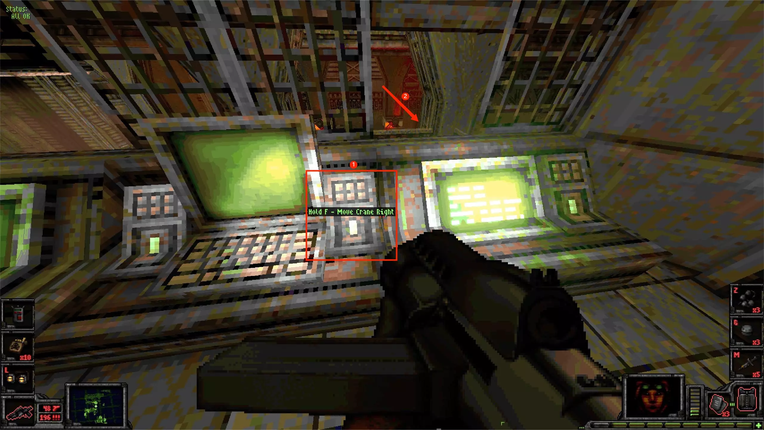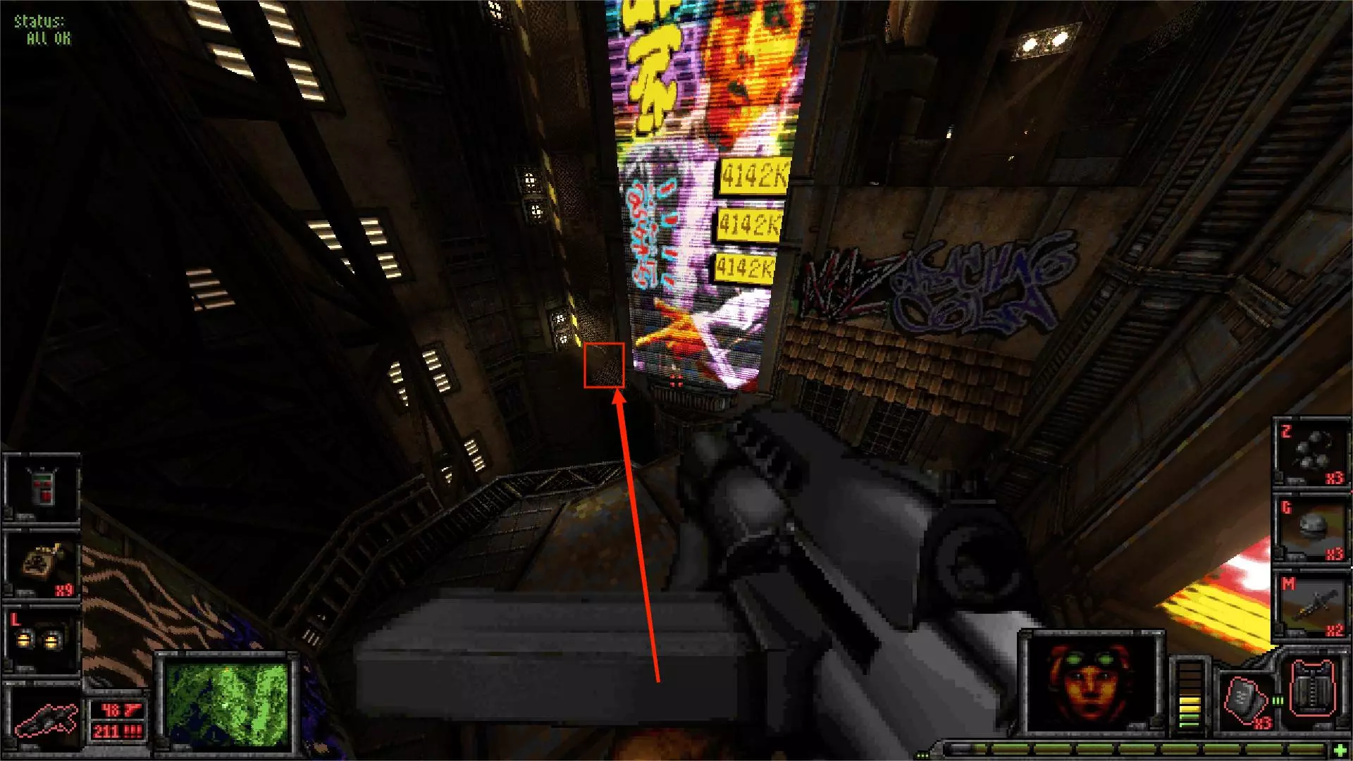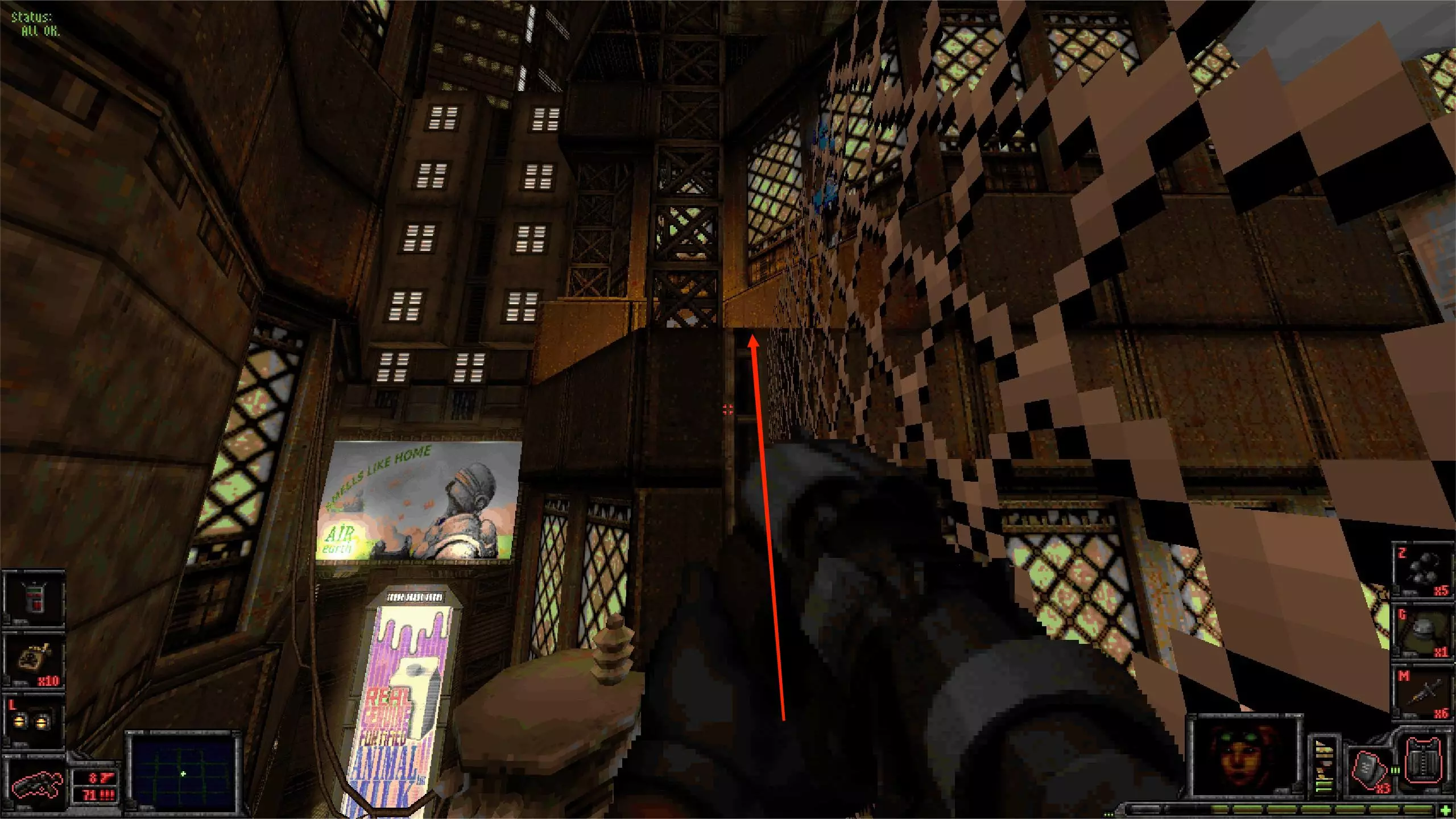 外部区域A [5/11] 楼梯 在此处你会受到飞艇的攻击。从缝隙向外看,它在最右侧。跟着箭头指示就能找到它。 你可以直接向其射击,如果你擅长跑酷,也可以从它上方直接过去。那里有一些补给品。