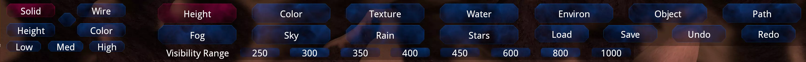 视图 实体 - 显示所有纹理和颜色 线框 - 显示地形的线框结构 高度 - 显示地形的高度比例,有助于精细调整 颜色 - 仅显示颜色图层 低 - 待定 - 灰度图?中等 - 待定 高 - 待定 画笔宽度 - 画笔的宽度 深度 - 画笔的深度 形状: 方形 - 100%坡度方形 圆形 - 100%坡度缩放圆形 锥形 - 中心尖锐的锥形 钟形 - 柔和圆润的钟形 模式: 绘制 - 前景色的全部值 喷涂 - 在同一区域时逐渐增加至前景色值 提升 - 根据所选形状逐渐提升数值 混合 - 混合画笔范围内的数值 取色器 - 用于选择高度/纹理/颜色/对象数值 高度压力 - 除“绘制”外其他画笔应用高度的速率 前景色 - 画笔设置的最大高度(左键点击) 背景色 - 画笔设置的最小高度(右键点击) 用前景色填充 - 用所选前景色高度值填充地图雨水开关/开启/关闭/切换 - 设置地图雨水效果 雨水颜色面板 - 预设雨水颜色值 雨水纹理列表 - 预设雨水纹理列表 雨水速度选择 - 雨水下落速度 雨水大小选择 - 雨滴大小 区块大小选择 - 生成并渲染的雨水区块大小 雨水密度选择 - 雨水聚集密度 雨水方向选择 - 雨水下落方向 开启时长 - 雨水持续生效的时间 关闭时长 - 雨水停止生效的时间 过渡时长 - 雨水开始下落或停止下落的过渡时间 星辰调节: 添加 - 以实体纹理形式在天空穹顶添加星辰 混合 - 将星辰以透明效果混合到天空穹顶 可见范围 - 可见范围预设可见范围值(这些会影响游戏中的渲染距离和交互距离) 路径点编辑介绍 路径点是地图上为支持游戏逻辑而必须存在的位置。它们可用于多种不同用途,例如生成点、驻守位置和地图边界。 注意:这些点的具体使用取决于地图的任务类型和AIP。颜色压力 - 除“绘制”外的其他笔刷的颜色应用速率 前景色板 - 笔刷设置的颜色(左键点击) 背景色板 - 笔刷设置的颜色(右键点击) 填充前景色 - 用所选前景色值填充地图 纹理图层 - 正在编辑的活动图层。按下S键将隐藏未选中图层上存储的纹理值。 压力 - 除“绘制”外的其他笔刷的纹理应用速率 前景 - 笔刷设置的最大不透明度(左键点击) 背景 - 笔刷设置的最小不透明度(右键点击) 填充选项 - 顾名思义,将应用前景不透明度设置。工具:水体 您在所有图层中只能拥有一个瓦片集 宽度 - 瓦片放置尺寸 深度 - 瓦片放置尺寸 图层 - 用于选择以下不同数值的图层选择器: 高度 - 图层所处高度 速度 - 图层移动速度 重复 - 纹理重复频率 方向 - 纹理重复角度 每个图层有两种纹理和颜色: 纹理1 - 顶层纹理,指定.dds或.tga 使用说明 纹理 - 纹理选择器 纹理1透明度 - 纹理的不透明度 颜色1 - 颜色选择器 水伤害 - 每次滴答的伤害施加速率 水 fog - 水层 fog 的设置方式 顶部: 顶部米数:顶部 fog 的观察距离(以米为单位) 中断点:顶部 fog 的停止位置 深度:fog 的延伸深度 底部: 与上述相同,但从水层下方地形的水底开始。 环境放置:放置所选环境物体 擦除:擦除所选环境物体 取色器:选择光标处当前的环境物体 配置 - 物体的 odf 名称 标签 - 物体的标签 名称 - 物体的名称 队伍 - 物体的队伍分配(为什么?真的吗?我猜应该总是道具队伍...)高度 - 对象放置的高度 导出名称 - 你的odf名称(不含.odf后缀) XSI - 旧模型版本 FBX - 新模型版本(仅在当前社区测试版中可用,可能即将正式上线) 导出 - 选择此选项将导出当前选中内容,你的 tiles 必须处于蓝色高亮状态,且如果顶点数量过多可能会失败。请限制你的选择范围。物体放置 - 放置所选游戏物体 擦除 - 擦除所选游戏物体 取色器 - 选择光标当前指向的游戏物体 移动 - 允许移动物体 高度 - 物体生成或调整后的地形上方高度 配置 - 物体的ODF文件名 标签 - 将保存在BZN文件中的物体标签 名称 - 游戏中交互时物体的可见名称 队伍 - 物体的队伍设置 组 - 物体的F槽或非F槽组 技能 - 如适用,物体的AI技能等级 显示全部 - 玩家无需知道ODF名称即可生成的物体列表 光标贴地 - 若激活,将物体设置在地形高度加上指定高度处 对齐 - 将物体对齐至中心【地图设置路径】加载地图时将运行哪个脚本。 死亡竞赛 - 我们曾经玩过的那种模式 即时行动 - 单人即时行动 MPI - 多人即时行动 策略 - 常规策略模式 策略夺旗 - 策略+夺旗模式 Lua任务 - 特定任务的脚本名称 strategy02.dll - VSR专用,仅在VSR激活时可用。请参阅VSR地图信息部分。 无 - 无脚本 【雾效】 雾色面板 - 易于使用的预配置RGB雾色 雾效范围选择 - 预配置的雾效范围值 可见范围 - 预配置的可见范围值(这些会影响游戏中的渲染距离和交互距离) 【地面雾设置】 不要使用此项,不要选择此项,假装它不存在!这会创建“局部雾”,这种雾效斑块非常消耗资源。请勿使用。 如果您确实选择了这个不恰当的开关,将需要通过命令行来修复。这在雾效命令行部分有说明。 天空开关 穹顶 - 设置穹顶模型是否可见 开关 星辰 - 设置星辰是否可见 开关 平面 - 设置平面天空是否可见 开关 云层 - 设置云层是否可见 开关 精灵 - 设置精灵是否可见 开关 太阳 - 设置太阳精灵是否可见 天空环境色板 - 预配置的天空环境色RGB值 天空颜色色板 - 预配置的天空颜色RGB值 穹顶模型列表 - 可供选择的穹顶模型列表 天空高度选择 - 预配置的天空高度 天空设置 - 包含所有预配置的上述所有物品及更多物品的天空文件。