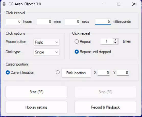 在本指南中,我将为你展示获取《亨利火柴人合集》中所有角色档案的最简单方法 步骤1 首先,你需要下载一个名为“OP自动点击器”的软件。 步骤2 打开该软件,将“点击间隔”值从100毫秒更改为5毫秒。然后,将“点击选项”中的“鼠标按钮”从左键更改为右键。 如果所有设置都正确,你会看到类似这样的界面。