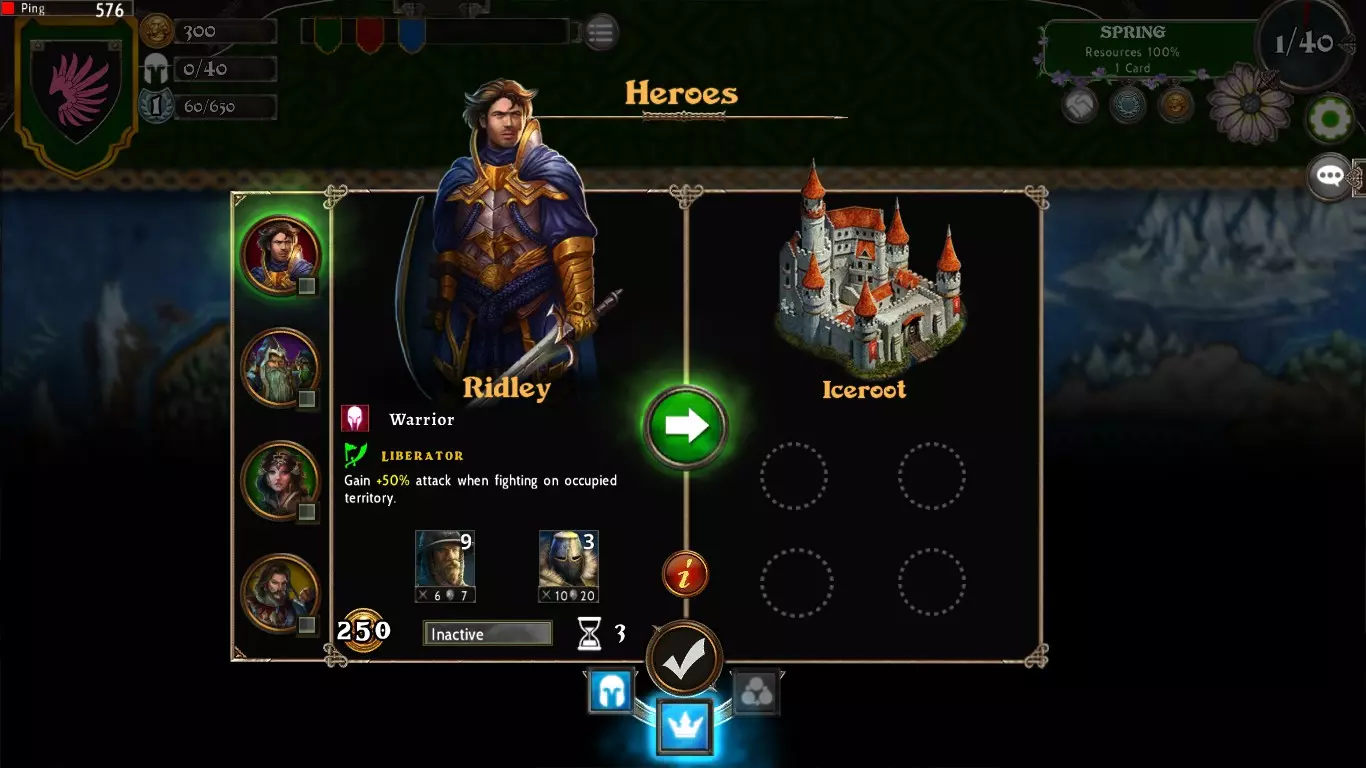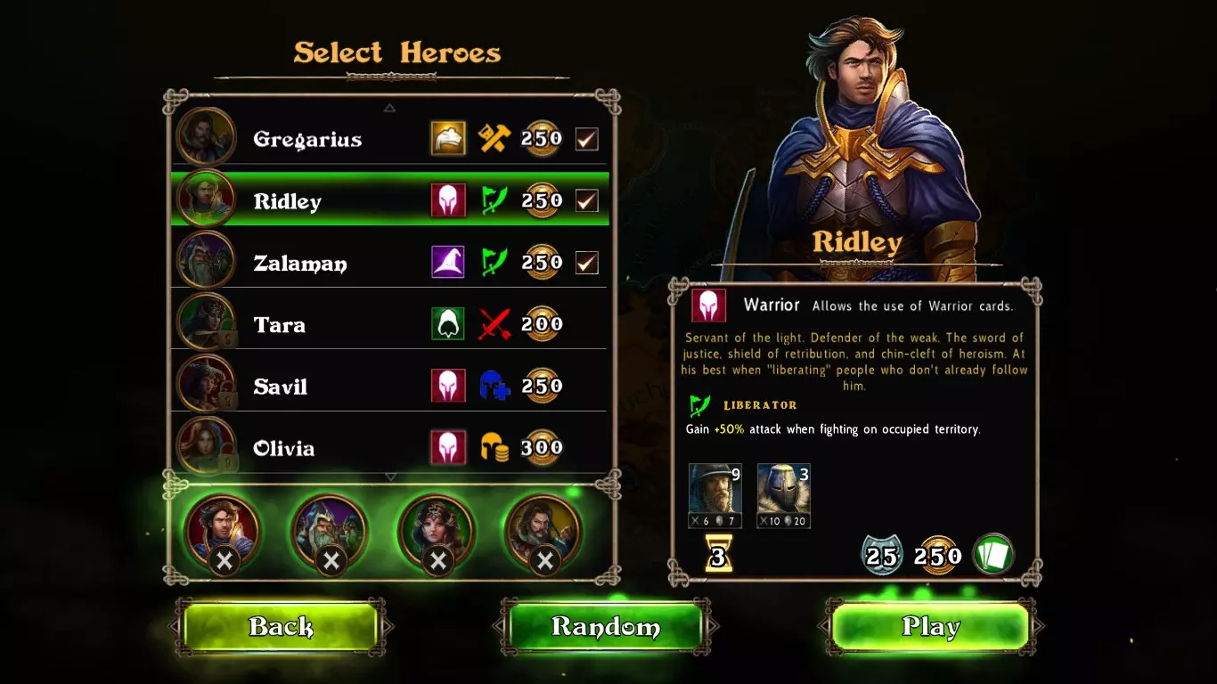 4. 选择英雄。你可以选择四名将在游戏中使用的英雄。回合开始时,你将拥有初始300金币,可用于唤醒英雄。每个英雄都有不同特性:攻击/防御属性、单位、胜利点数、被击败后的恢复回合数以及其他特殊特质。