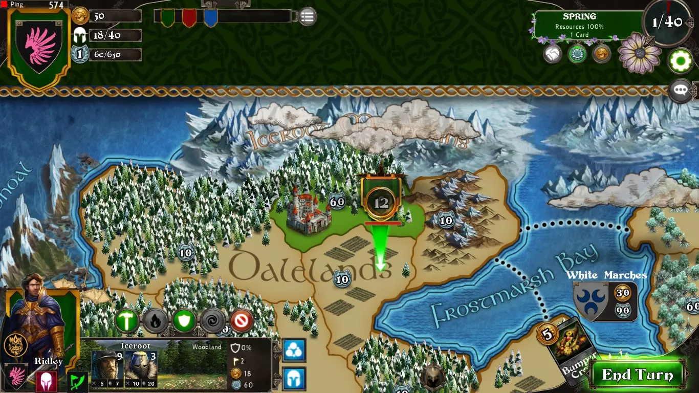 7.长按点击或按住拖动英雄来移动它并开始征服拥有同等胜利点的土地。第一个占领所有领土,或在回合结束时拥有最多胜利点的玩家赢得胜利!