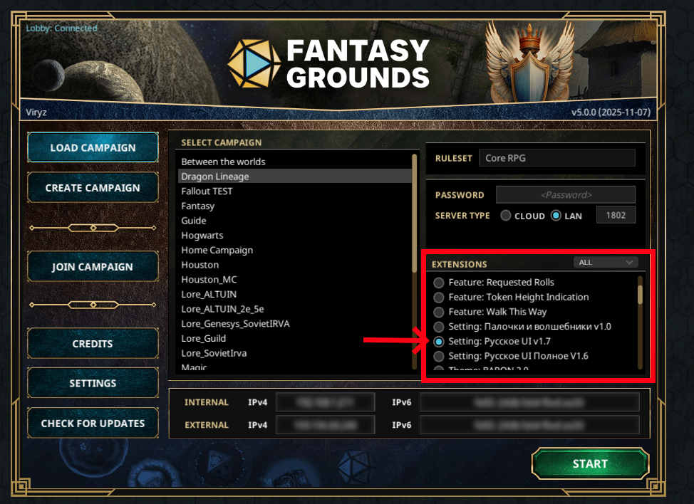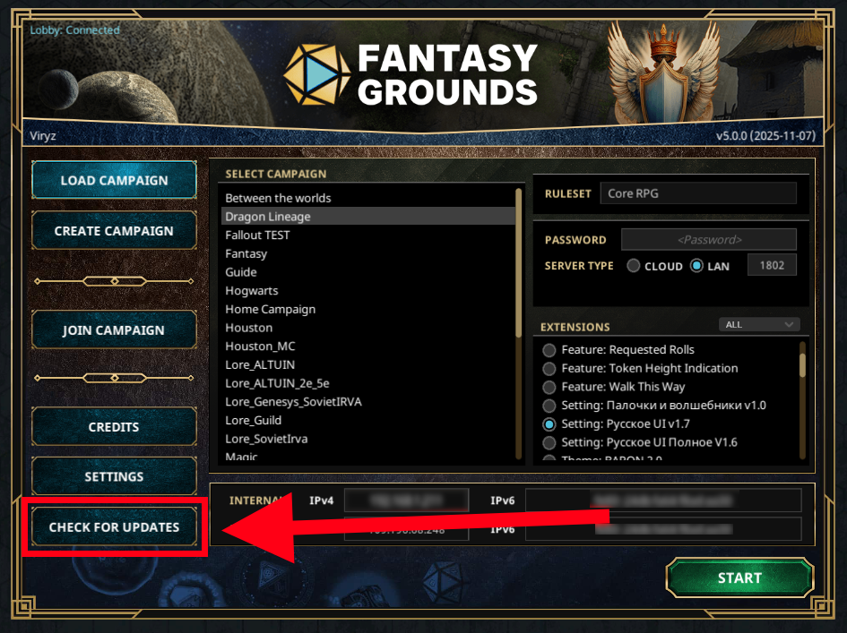 您也可以进行评分,我将不胜感激。 安装步骤: 1. 订阅扩展后,您需要启动Fantasy Grounds。 2. 在程序启动器中点击检查更新。