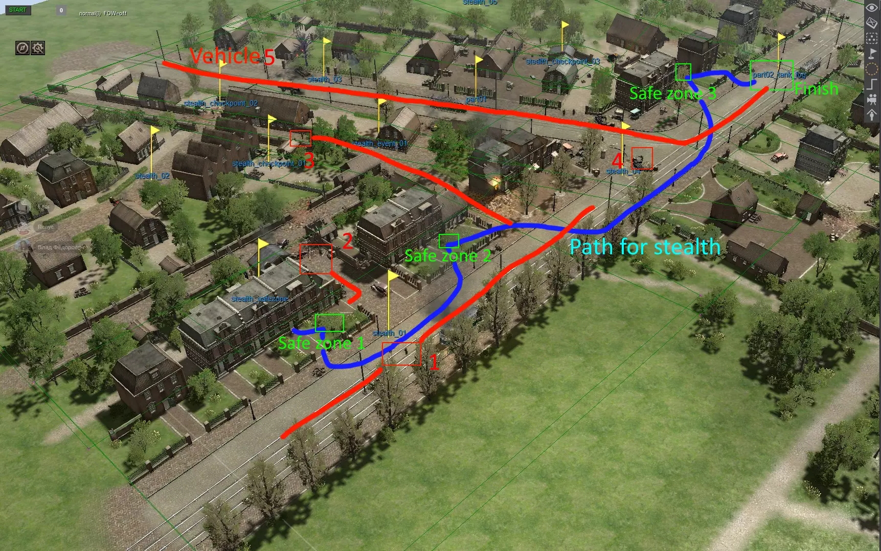 【不死之影】 “在不被发现且不杀人的情况下抵达英军处”。以下是一种可行的路线方法。不需要所有士兵都到达。我在游玩时让4名士兵中的3名直接到达了。可能1名士兵到达就足以触发脚本。潜行时应按以下步骤操作: 1. 等待巡逻队2离开电车轨道,巡逻队1前往巡逻队4处。潜行至安全区域2。 2.在安全区2内,等待巡逻队2离开巡逻队4的区域,同时等待巡逻队3也离开巡逻队4的区域。 3. 匍匐到地图的最边缘,然后沿着边界和电车轨道移动。巡逻队4不会注意到。 4. 大约在经过巡逻队4的位置时,会出现【巡逻队5】的载具。 5. 继续沿着蓝色路线向安全区3移动。我们能在车辆到达之前,以及巡逻队1追上我们之前爬过去,尽管他们几乎就在我们身后。 6. 等待车辆开过后,爬向“终点”标记。 “Reach the British positions unspotted and without kills”。以下是一种可行的路线。你不必让所有士兵全程爬行。在我的游戏过程中,我让四个士兵中的三个爬行了。也许只要一个士兵爬行就能触发脚本。爬行步骤如下: 1. 等待巡逻队2离开电车轨道,巡逻队1向巡逻队4移动。爬向安全区2。 2.在安全区2内,等待巡逻队2远离巡逻队4,同时等待巡逻队3也远离巡逻队4。 3. 匍匐到地图的最边缘,然后沿着边界和电车轨道移动。巡逻队4不会注意到你。 4. 在与巡逻队4的交叉区域附近,会有一辆载具——【巡逻队5】抵达。 5. 沿着蓝色路线继续向安全区3移动。我们有足够的时间在车辆抵达以及巡逻队1追上来之前匍匐前进,尽管巡逻队1几乎就在我们身后。 6. 等待车辆经过后,匍匐到【终点】标记处。