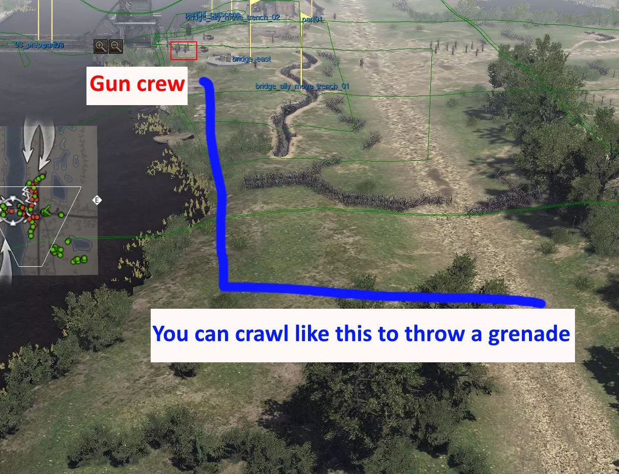 不许碰! “在KwK 39炮组人员登上火炮前消灭他们”。任务刚开始时,火炮附近有一个3人炮组。最佳方案是沿着战壕匍匐前进,然后投掷手榴弹将他们一次性全部炸死。