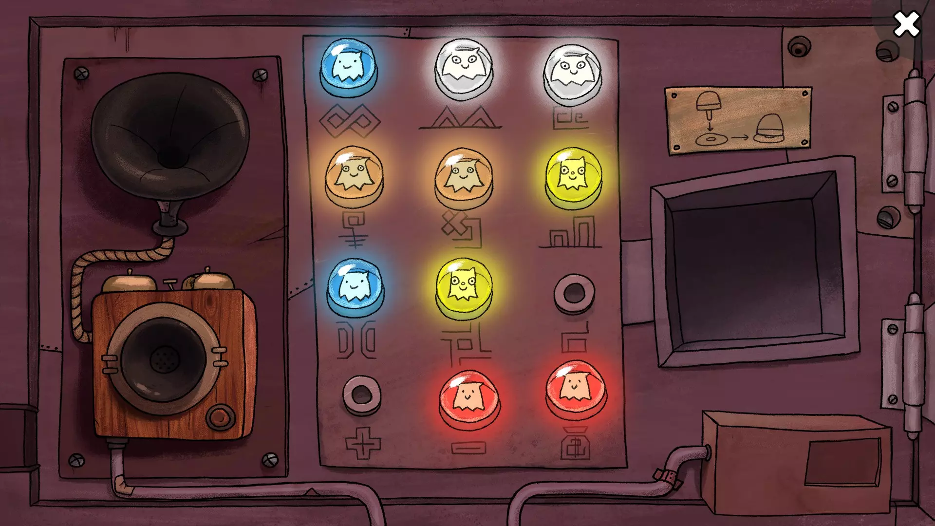 负数行不通 错误配置售票机。 劳拉必须用插头配置售票机。有两种配置是可接受的——正数和负数。区别在于最下面一行的红色插头是插在加号还是减号上。 将红色插头插入减号,完成其余配置。现在以罗伯特的身份与售票机对话。