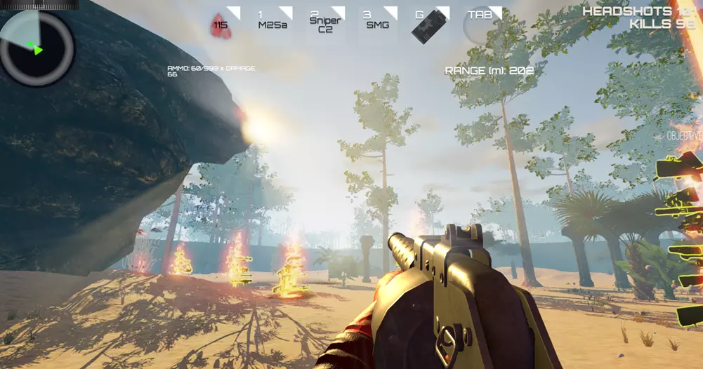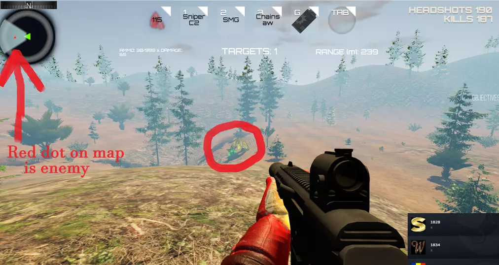 步骤4 4) 当你在地图(屏幕左上角)上看到红色三角形时,那就是 Boss,去消灭他。你拥有无限生命值和无限弹药,所以不会死亡。