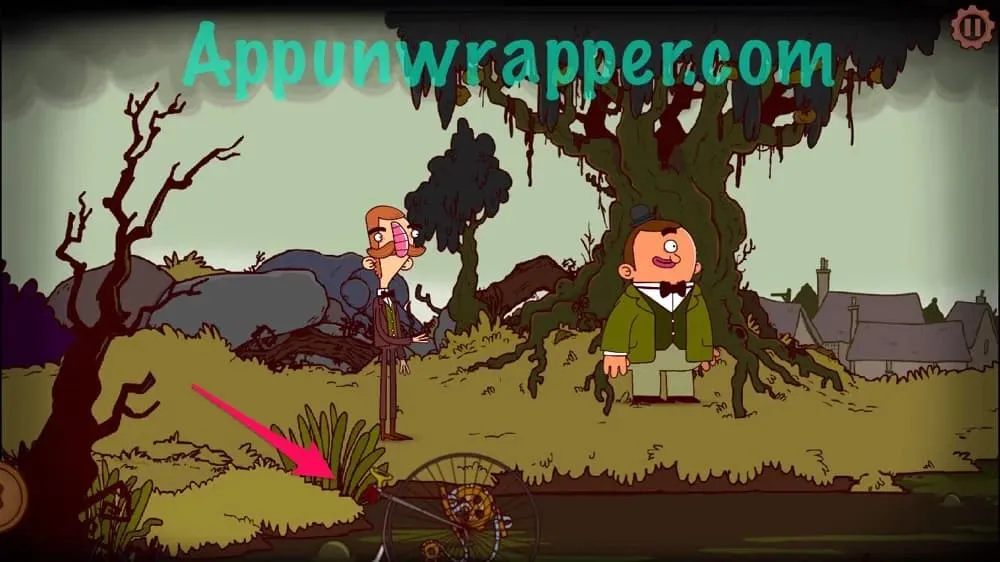 20. 回到苹果树下。用绳子把陷在沼泽里的高轮自行车的脚踏板和曲柄摇下来并拿走。