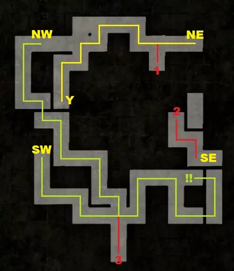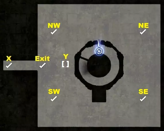 西北、东北、东南、西南:迷宫入口点 X、Y:返回点 迷宫 其走廊内有立方体,互动时会移动。它们会开启迷宫的新区域,并封锁身后的区域,因此是单向路径。不要被3D布局和移动所迷惑,从俯视角度看,可用路径呈直线模式。 如果某个立方体变为非活动状态,请寻找新的立方体。大多数情况下只有一个活动立方体,但有时会有两个,你必须做出选择——最好仔细查看。此外,敌人会生成,你必须在这些相当有限的空间内与它们战斗。 你的目标是标有!!的东南方地砖