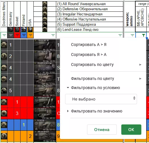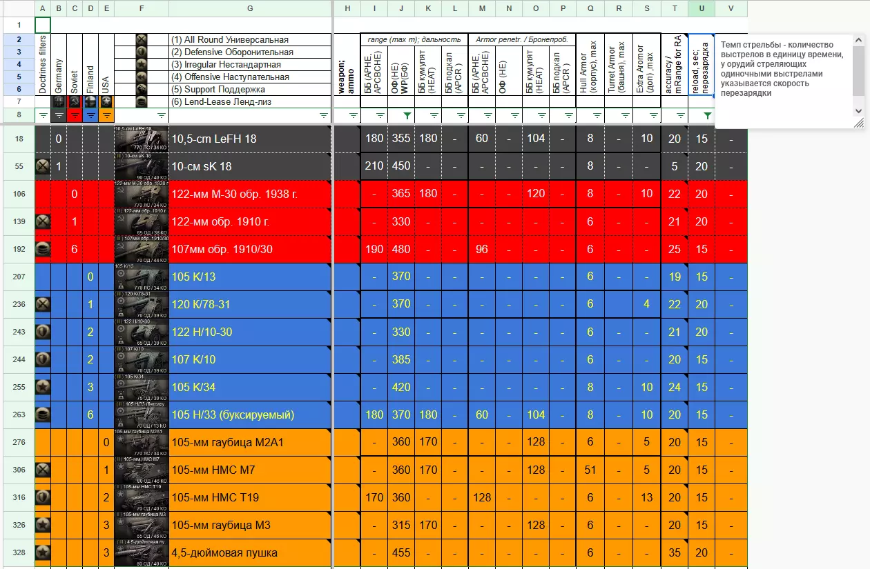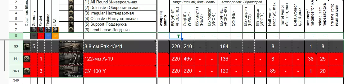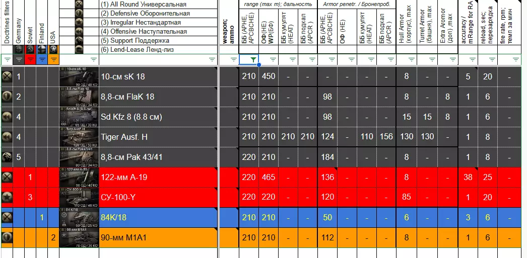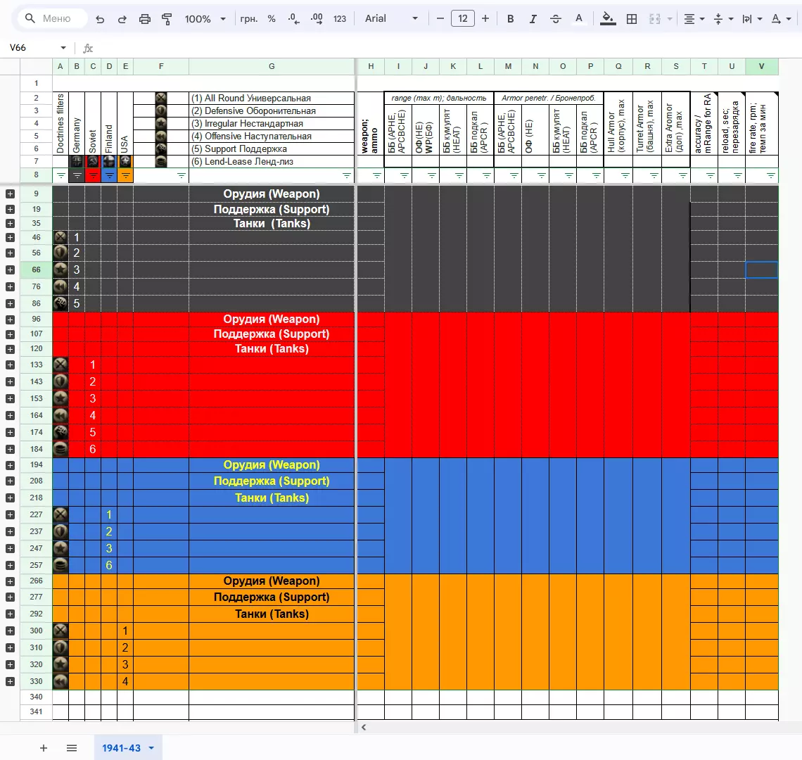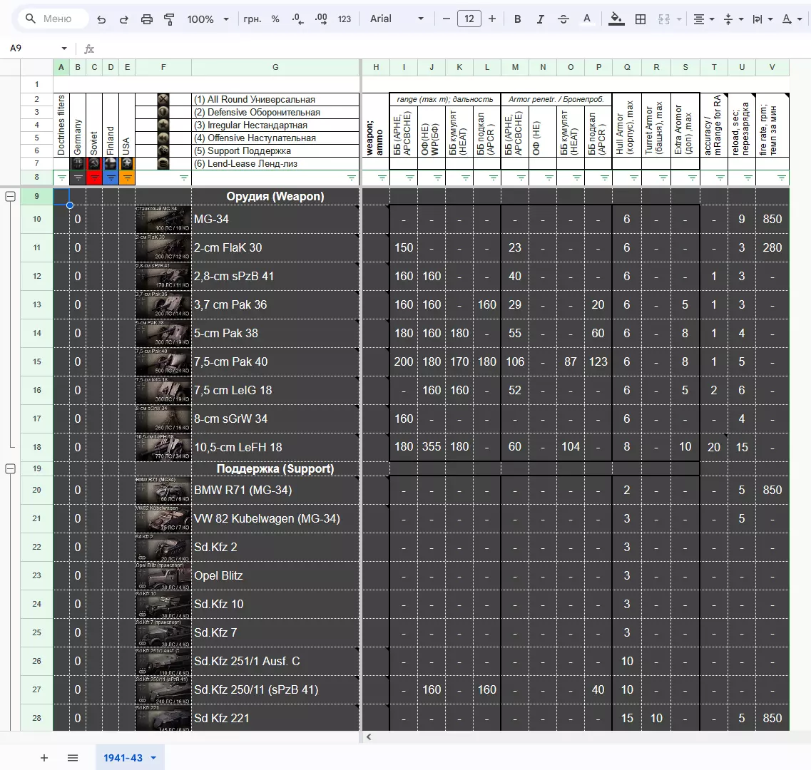 本指南将军事装备及其武器的数量参数整理到了谷歌表格中。为便于数据分析,表格中设置了筛选功能,可帮助玩家根据一个或多个数值对数据进行排序。希望这些信息能对玩家有所帮助。 中期战争 1941-1943 折叠状态下的表格: