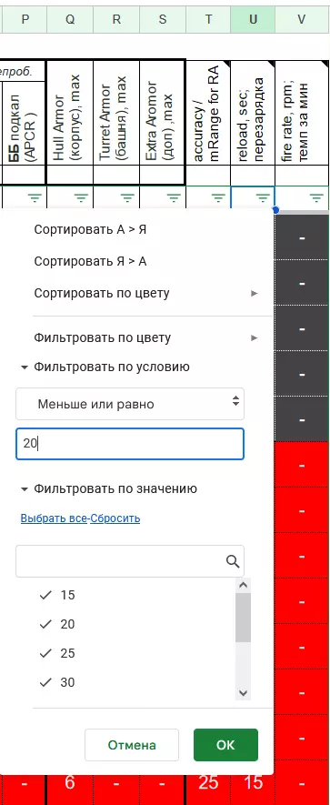3. 点击【确定】并获取中间结果。 4. 在U列中点击鼠标左键调用筛选功能。在菜单中选择【按条件筛选】中的【小于或等于】选项,并输入【20】。