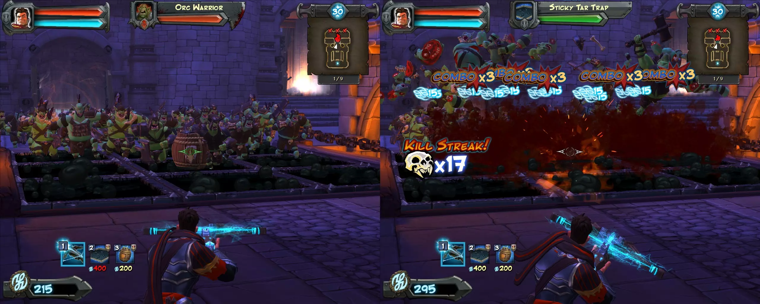 【无陷阱通关!】 在不使用任何陷阱的情况下,通关第二章或第三章的关卡。这包含两个成就,一个要求仅使用一种陷阱类型,另一个要求完全不使用陷阱。通过无陷阱通关,你可以同时获得这两个成就。 规则: - 弓箭手/圣骑士不算作“陷阱”(即你可以随意使用它们)。 - 自动弩算作“陷阱”(与《兽人必须死2》不同,在《兽人必须死2》中自动弩被视为守卫)。 - 各种环境危险(如酸液大锅、滚动原木等)算作“陷阱”。 - 你可以使用任何武器和技能。 获得这些成就最简单的地方是“竞技场”地图。你只需要“弓箭手”“圣骑士”和“冰之护身符”(可选“ bladestaff”)。 开始游戏时,购买“强化之刃”,并在每个门附近放置两名圣骑士。