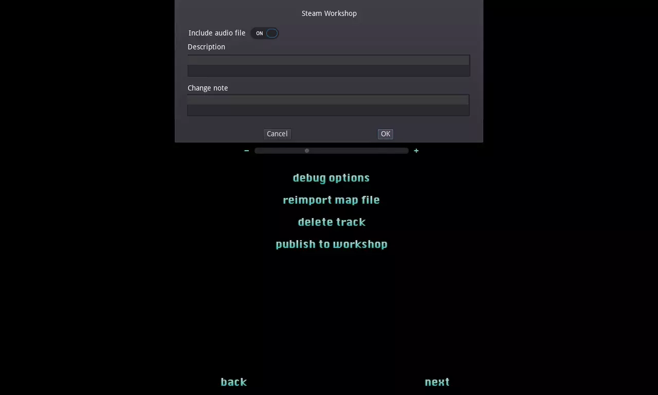 第四步:点击【发布至创意工坊】按钮并填写表单。 如果不想包含音乐音频文件,请取消勾选【包含音频文件】选项。此时,该音轨将以【OnlyMap】标签发布。否则,将使用【Full】标签。根据需要填写【描述】和【更新说明】字段,然后点击【确定】。