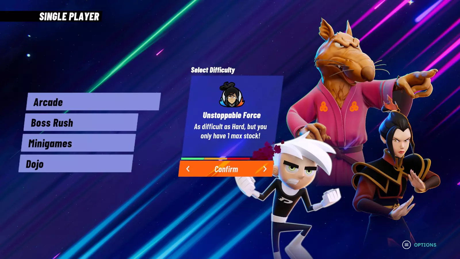 要完成这个成就,你需要在【Unstoppable Force】难度下通关街机模式。说起来容易做起来难,这取决于你使用的角色,尤其是你只有一条命。 我是用【Reptar】完成的。在我写这个攻略的时候,【Reptar】是游戏中最强的角色之一。他拥有强力且出手迅速的攻击,能轻松对付对手和 Boss。如果你难以完成这个成就,试试用这个绿色恐龙角色,尽力去赢得胜利并存活下来。