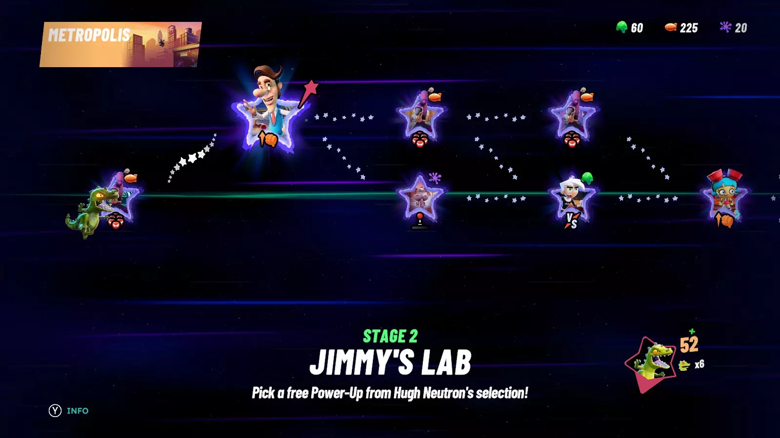 首先,选择【城市水族馆】舞台。该舞台应设有两个主平台,中央为水域。 然后更改规则,开启组队模式并将命数设为1。 创建3个9级CPU角色,并让它们处于同一队伍。对手角色是谁无关紧要。 开始对战后,待在中央附近,不要掉进水里。CPU们会试图接近你,最终可能掉进水中。 如果一切顺利,你可以在不到一分钟内解锁该成就。我测试了这个策略,虽然操作起来有点不稳定,但确实有效。战役成就介绍 《尼克儿童频道全明星大乱斗2》的一大卖点便是全新的战役模式,该模式让你在体验简单剧情的同时,还能感受融合了平台格斗玩法的 Roguelike 元素。因此,自然自然也会有与该模式相关的成就。 在继续介绍之前,我个人建议你从头到尾完成整个剧情。 这不仅是因为接下来的内容会包含该模式的剧透,还因为: A. 在你的游玩过程中,实际上就能获得其中的部分成就。 B. 随着剧情的深入,你会解锁一些有助于获取这些成就的实用工具。 所以,如果你想以全新的体验游玩并轻松解锁一些成就,那么请停止阅读。如果你已经通关游戏,或者不介意剧透,那就继续往下看吧! 击败 Boss 成就 我决定将这些成就单独列出来,这样就不会影响下一部分的内容。说实话,关于这些成就没太多好说的,连续重复六次相同的内容会显得啰嗦冗余。 你只需要知道: 在战役模式中至少击败所有 Boss 一次,即可获得这些成就。 按成就顺序排列的 Boss 为: 水母王 飞天荷兰人 施莱德 萨塔纳·德·洛斯·穆尔托斯 弗拉德·普拉斯米乌斯 发条机器人 这些都很容易理解。现在列出成就名称: Jellyfishing