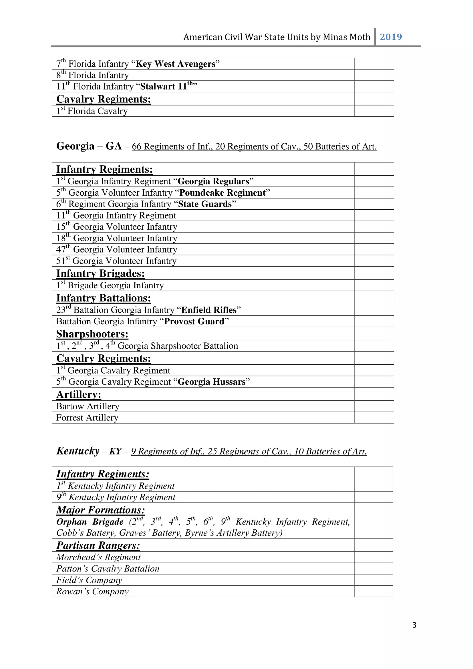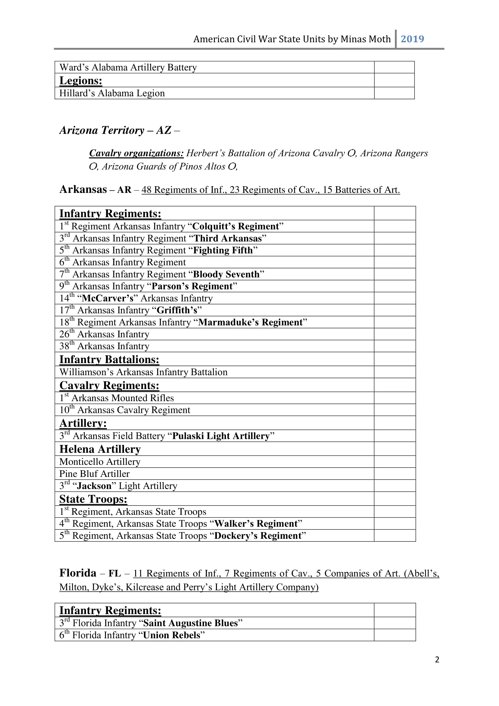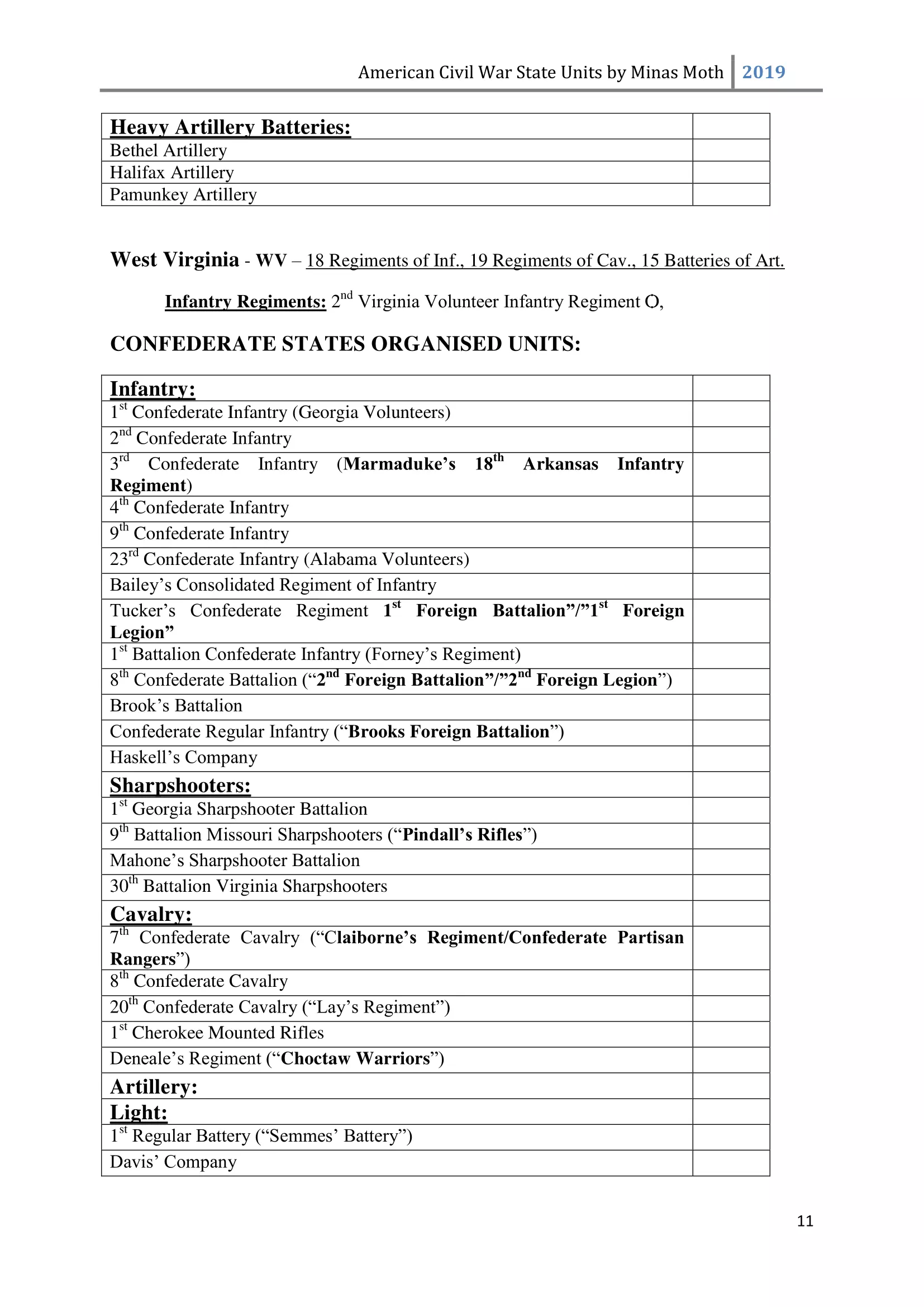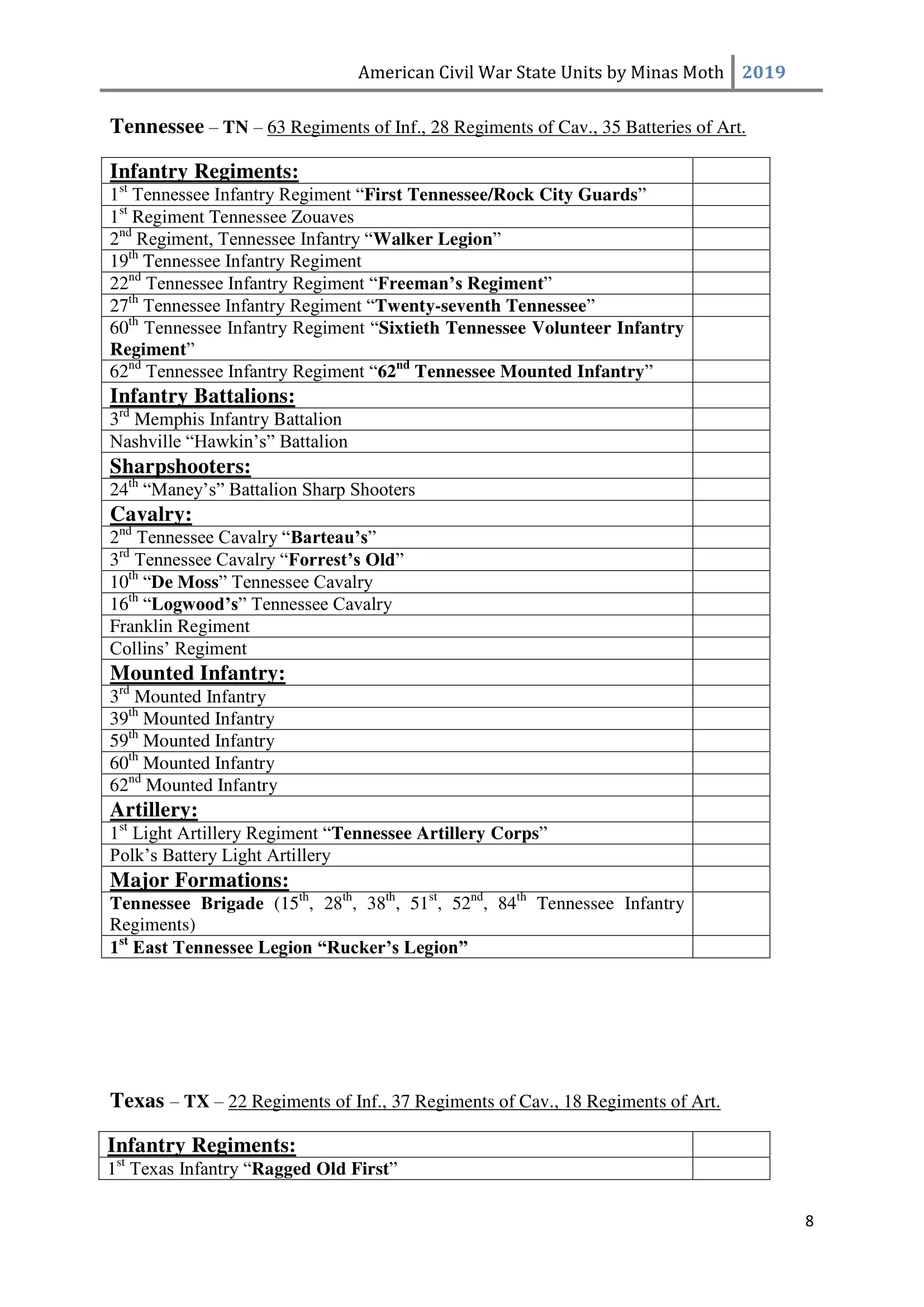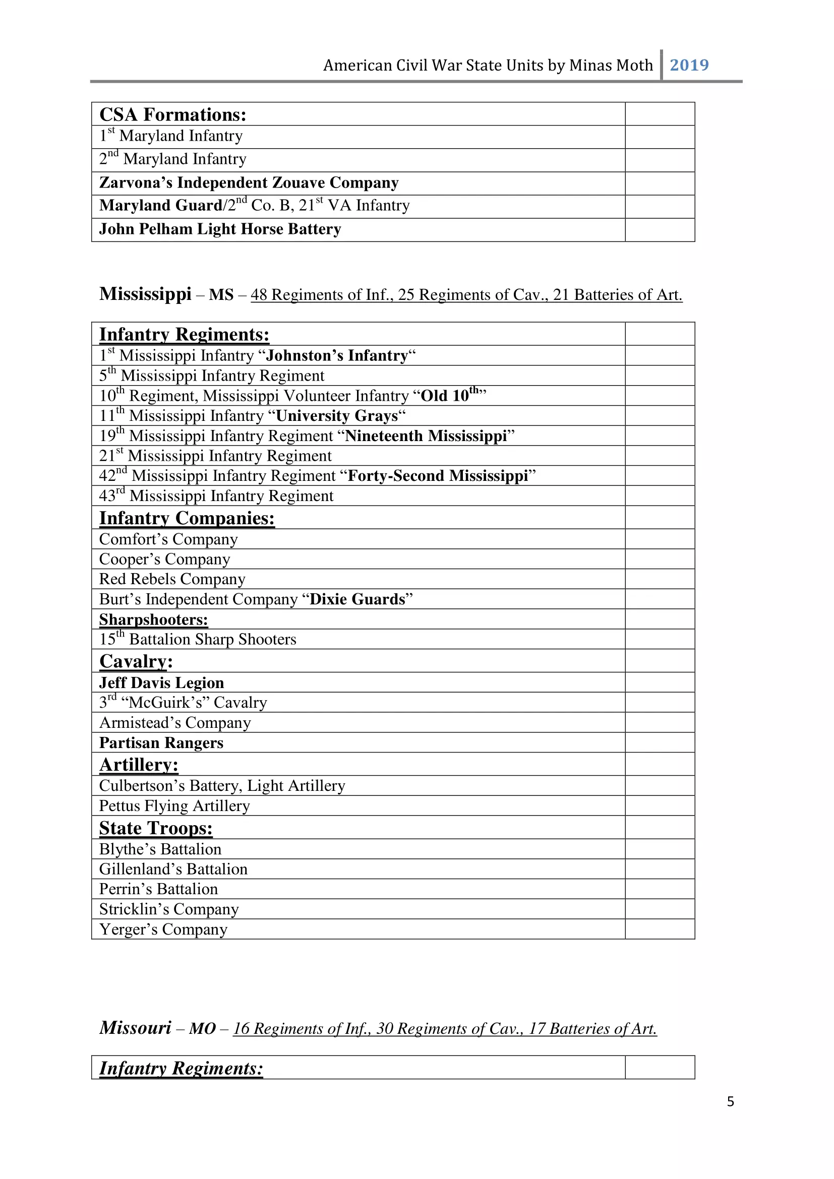 这是一份美国内战中或知名或不太为人知的团、连、营和旅的列表。其旨在供那些希望通过使用历史部队名称来获得额外沉浸感和体验的玩家使用。除部队名称外,还包含了所有南方邦联和北方联邦的州以及部分领地。 南方邦联部队 随着1860年末至1861年初战争可能性的增加,1861年2月28日,南方邦联临时国会组建了临时志愿军,并将军事指挥权授予新当选的南方邦联总统兼“总司令”杰斐逊·戴维斯。战争期间,南方邦联征召了75万至100万人。然而到1862年,北方联邦和南方邦联都被迫实施征兵制。南方联盟征召的士兵数量多于北方联邦,但具体数字同样无法确定。南方联盟的主要军队包括由罗伯特·李将军指挥的北弗吉尼亚军团和由约瑟夫·约翰斯顿将军指挥的田纳西军团。 战争期间,南方联盟的部队规模各不相同,但各单位的大致人数如下: 军团 - 24,000至28,000人 师 - 6,000至14,000人 旅 - 800至1,700人 团 - 350至400人 连 - 35至40人 这些数字与规定人数相去甚远(例如,一个团组建时本应有1,000人,分为10个连,每连100人),这是由于伤亡、疾病、逃兵等原因造成的。双方在部队兵力降至作战和有效最低人数时,都会采取部队整编措施,同时双方均会用新兵补充现有部队。 美利坚联盟国(C.S.A.)的特殊之处在于其设有上将(full General)军衔。最初,南部邦联国会将准将设为最高军衔,但随着战争的推进,其他更高的将官军衔被设立。在美利坚联盟国,仅有七人获得上将军衔,分别是塞缪尔·库珀、阿尔伯特·西德尼·约翰斯顿、罗伯特·E·李、约瑟夫·E·约翰斯顿、P·G·T·博雷加德、布拉克斯顿·布拉格和埃德蒙·柯比·史密斯。