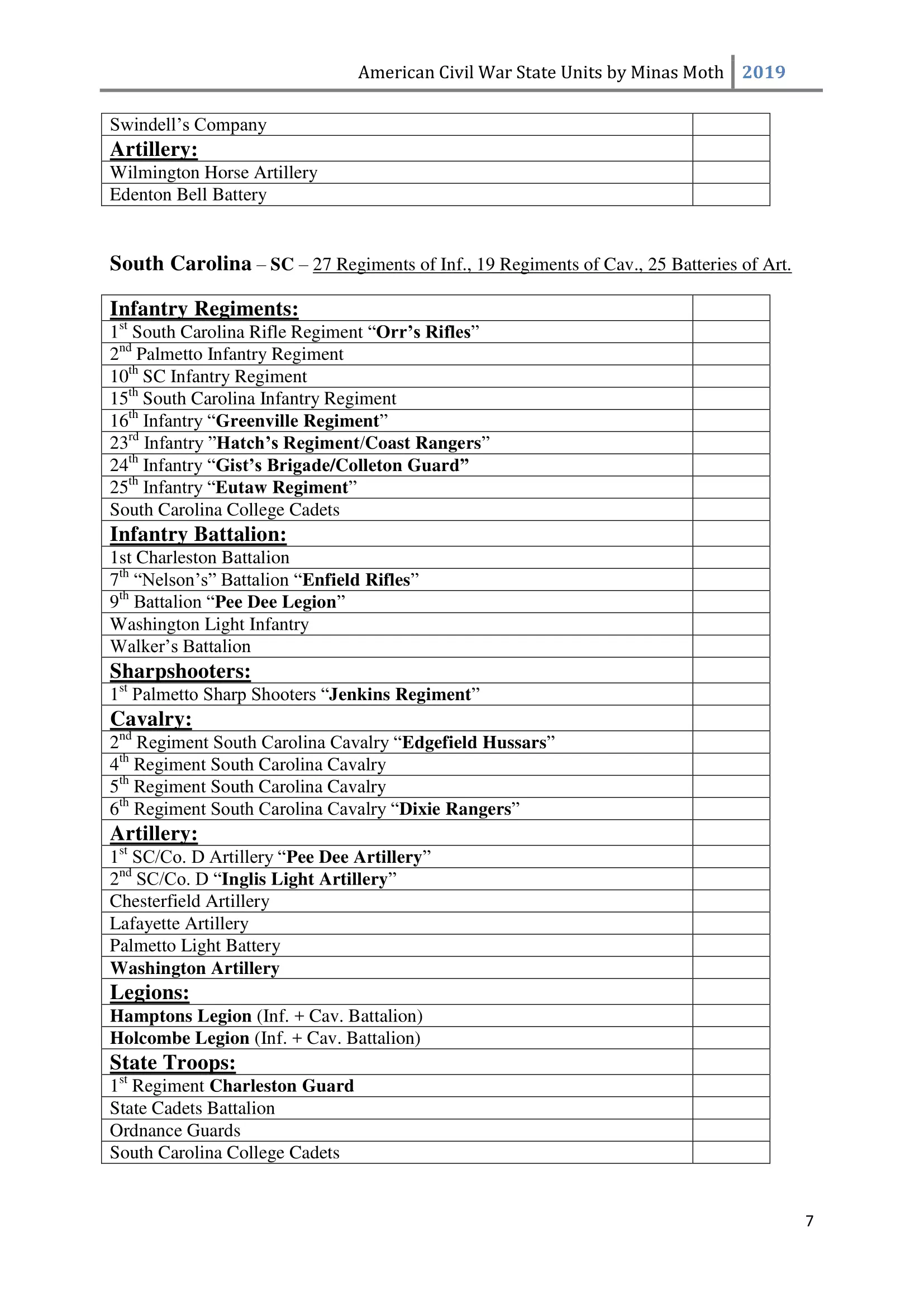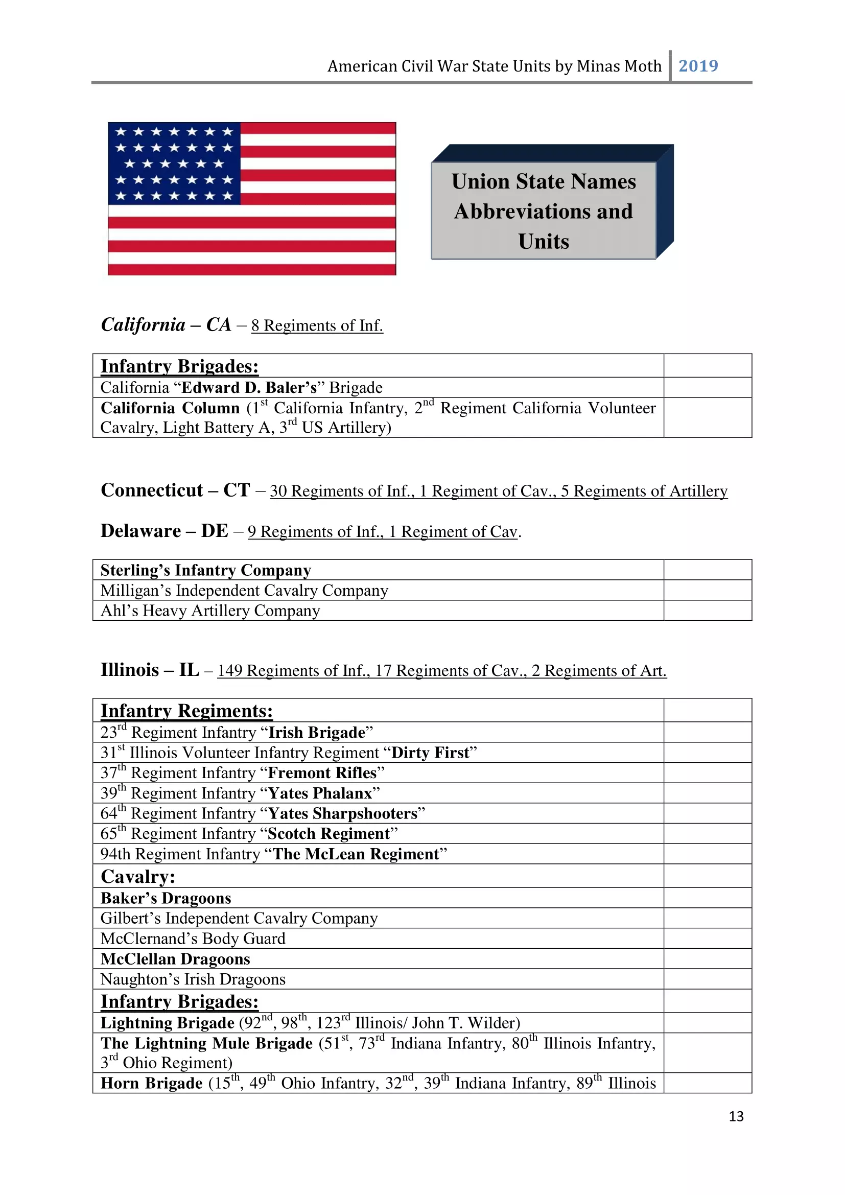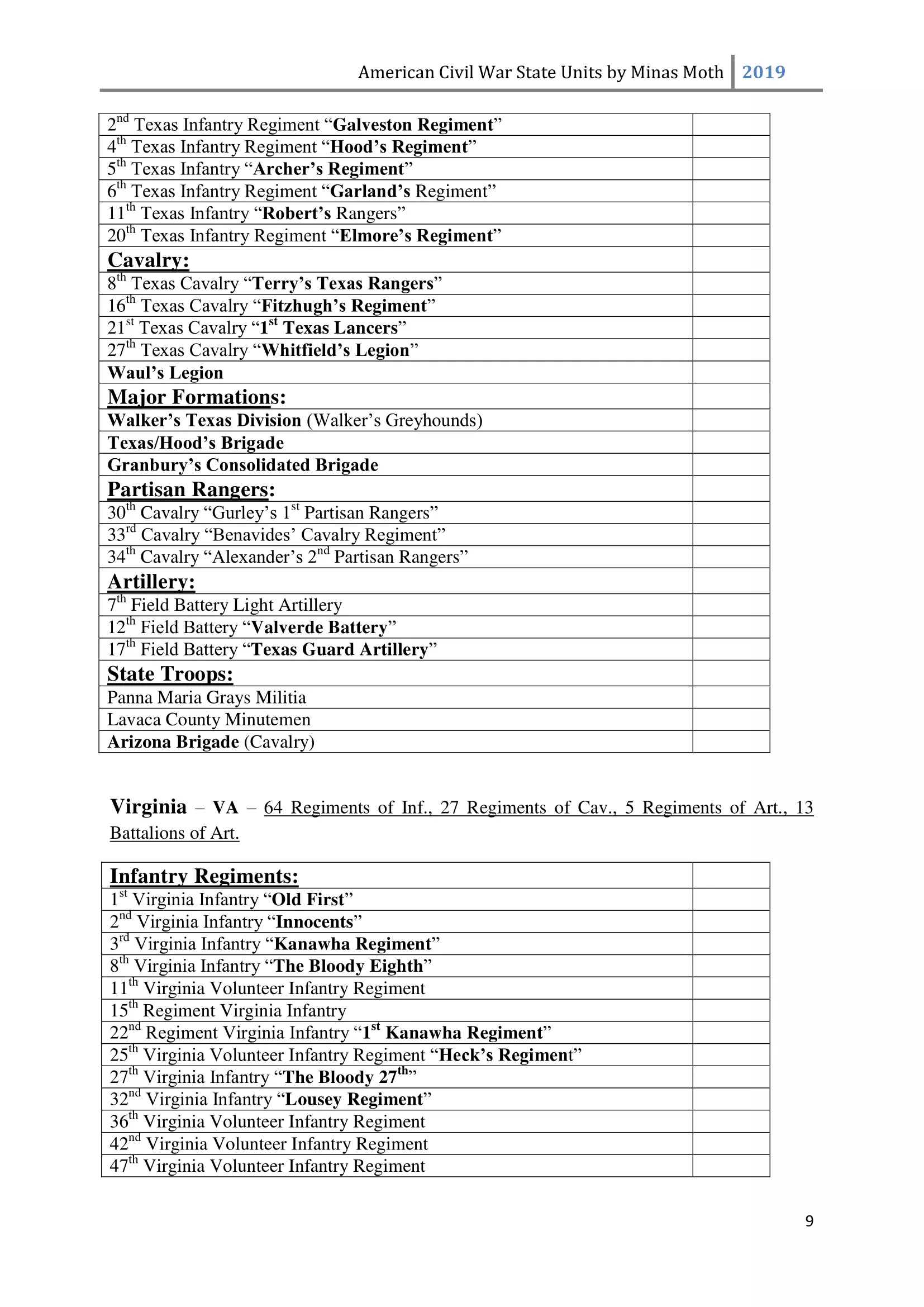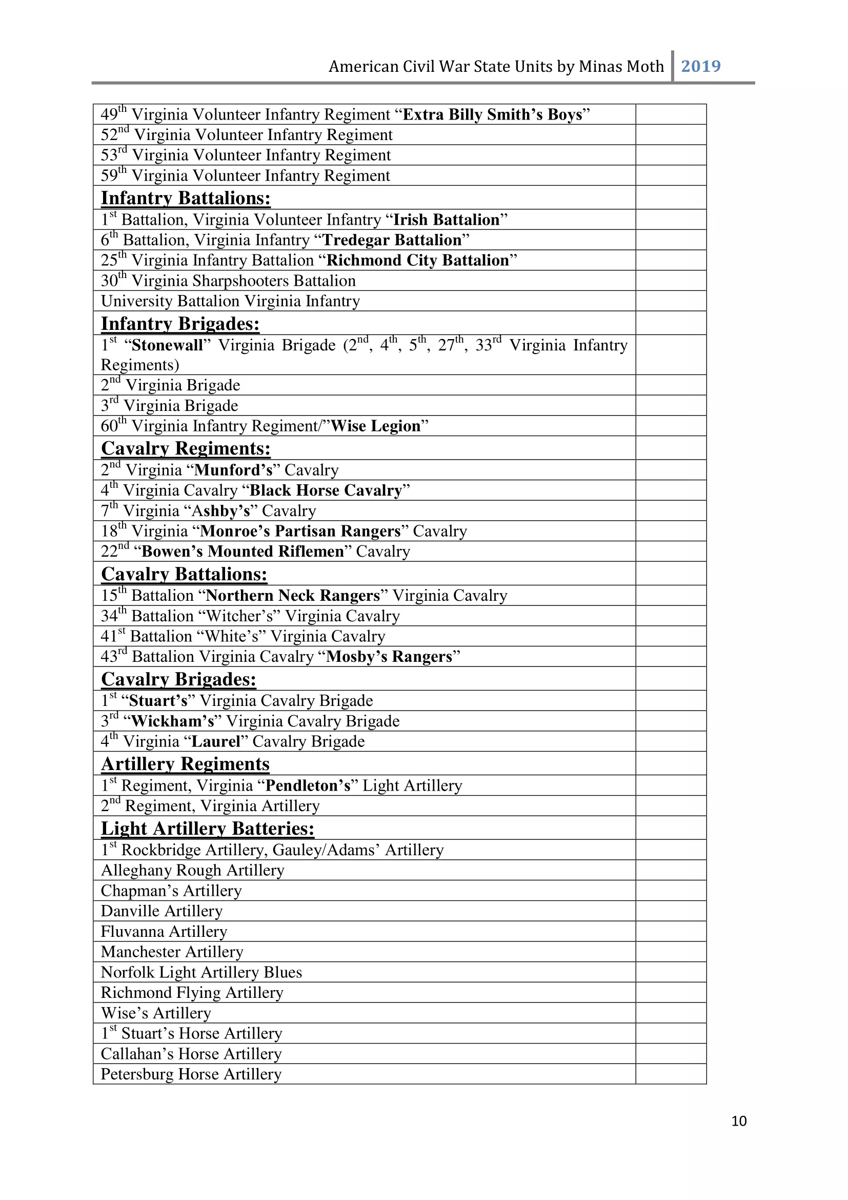 这是一份美国内战中或知名或不太为人知的团、连、营和旅的列表。其旨在供那些希望通过使用历史部队名称来获得额外沉浸感和体验的玩家使用。除部队名称外,还包含了所有南方邦联和北方联邦的州以及部分领地。 南方邦联部队 随着1860年末至1861年初战争可能性的增加,1861年2月28日,南方邦联临时国会组建了临时志愿军,并将军事指挥权授予新当选的南方邦联总统兼“总司令”杰斐逊·戴维斯。战争期间,南方邦联征召了75万至100万人。然而到1862年,北方联邦和南方邦联都被迫实施征兵制。南方联盟征召的士兵数量多于北方联邦,但具体数字同样无法确定。南方联盟的主要军队包括由罗伯特·李将军指挥的北弗吉尼亚军团和由约瑟夫·约翰斯顿将军指挥的田纳西军团。 战争期间,南方联盟的部队规模各不相同,但各单位的大致人数如下: 军团 - 24,000至28,000人 师 - 6,000至14,000人 旅 - 800至1,700人 团 - 350至400人 连 - 35至40人 这些数字与规定人数相去甚远(例如,一个团组建时本应有1,000人,分为10个连,每连100人),这是由于伤亡、疾病、逃兵等原因造成的。双方在部队兵力降至作战和有效最低人数时,都会采取部队整编措施,同时双方均会用新兵补充现有部队。 美利坚联盟国(C.S.A.)的特殊之处在于其设有上将(full General)军衔。最初,南部邦联国会将准将设为最高军衔,但随着战争的推进,其他更高的将官军衔被设立。在美利坚联盟国,仅有七人获得上将军衔,分别是塞缪尔·库珀、阿尔伯特·西德尼·约翰斯顿、罗伯特·E·李、约瑟夫·E·约翰斯顿、P·G·T·博雷加德、布拉克斯顿·布拉格和埃德蒙·柯比·史密斯。