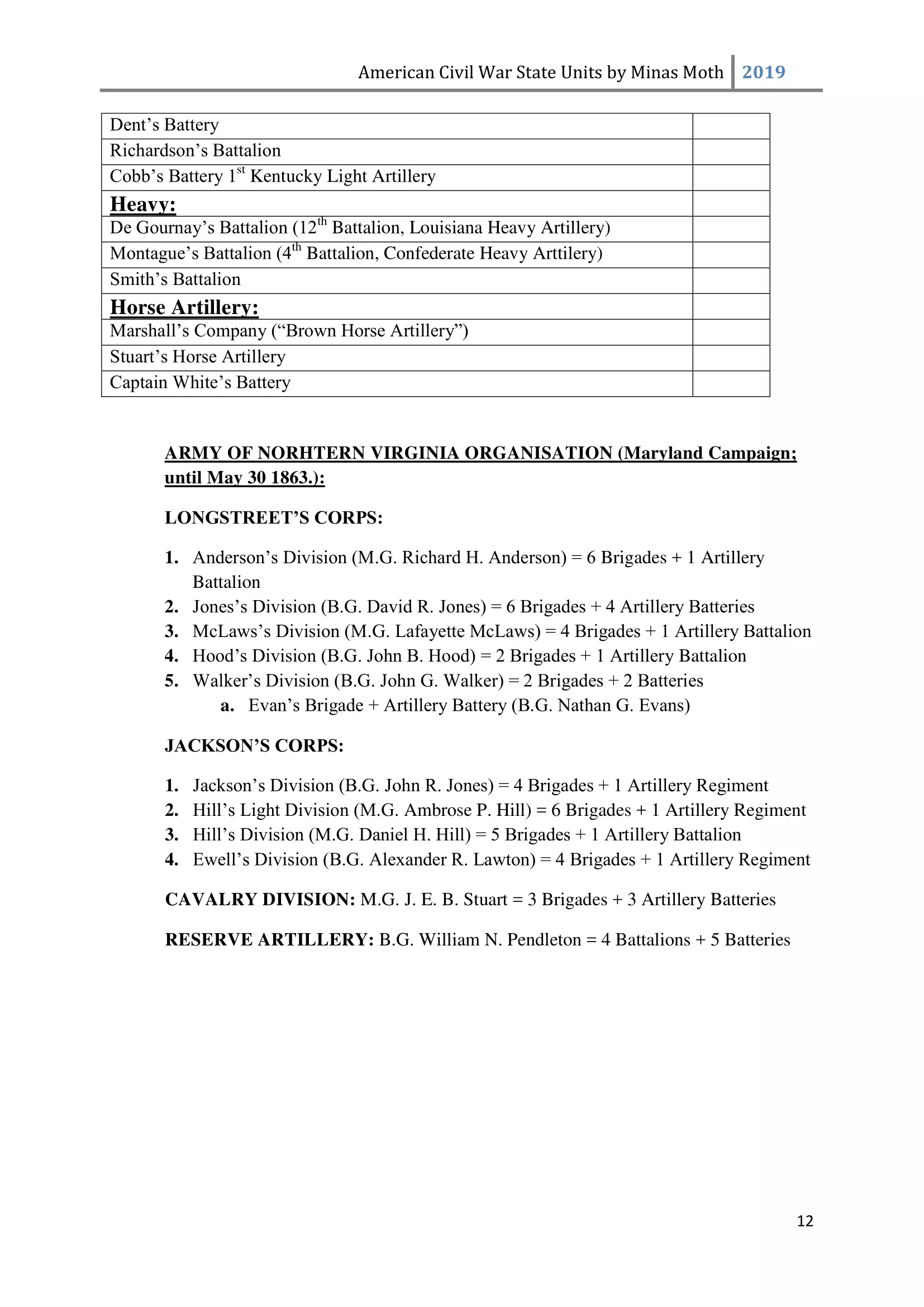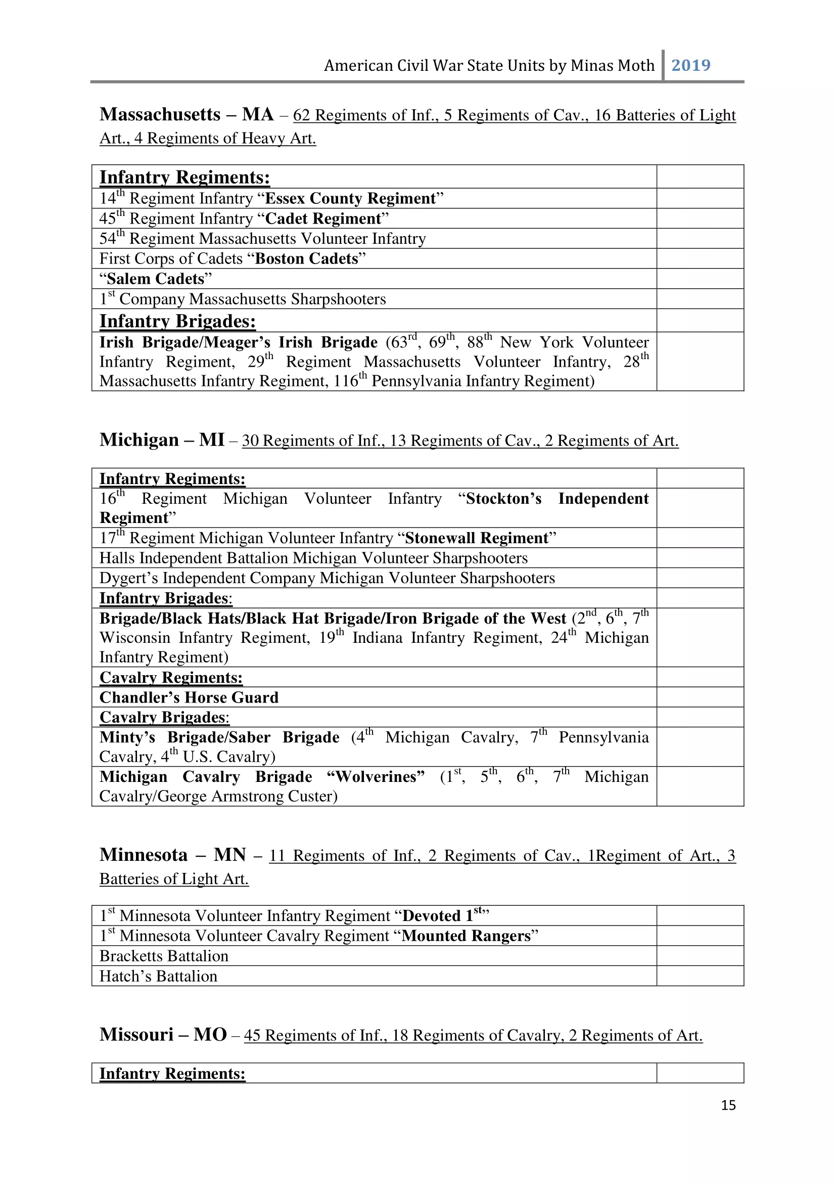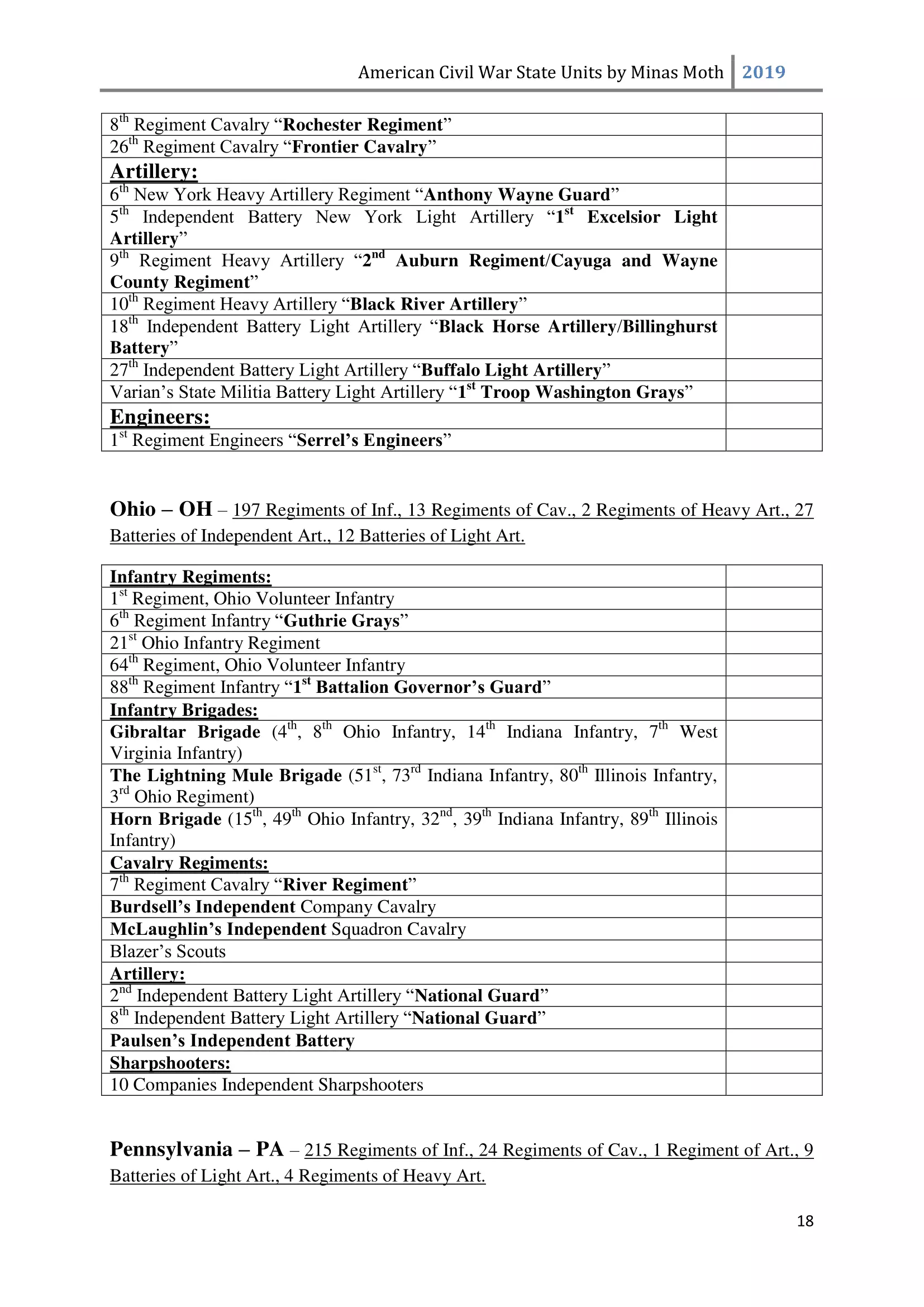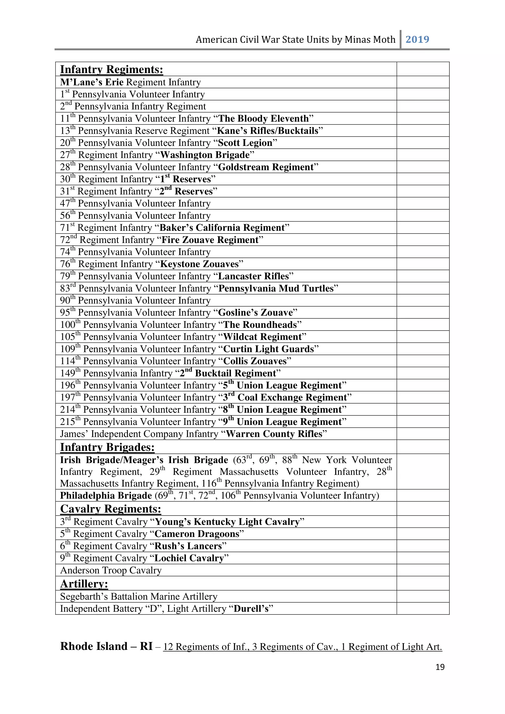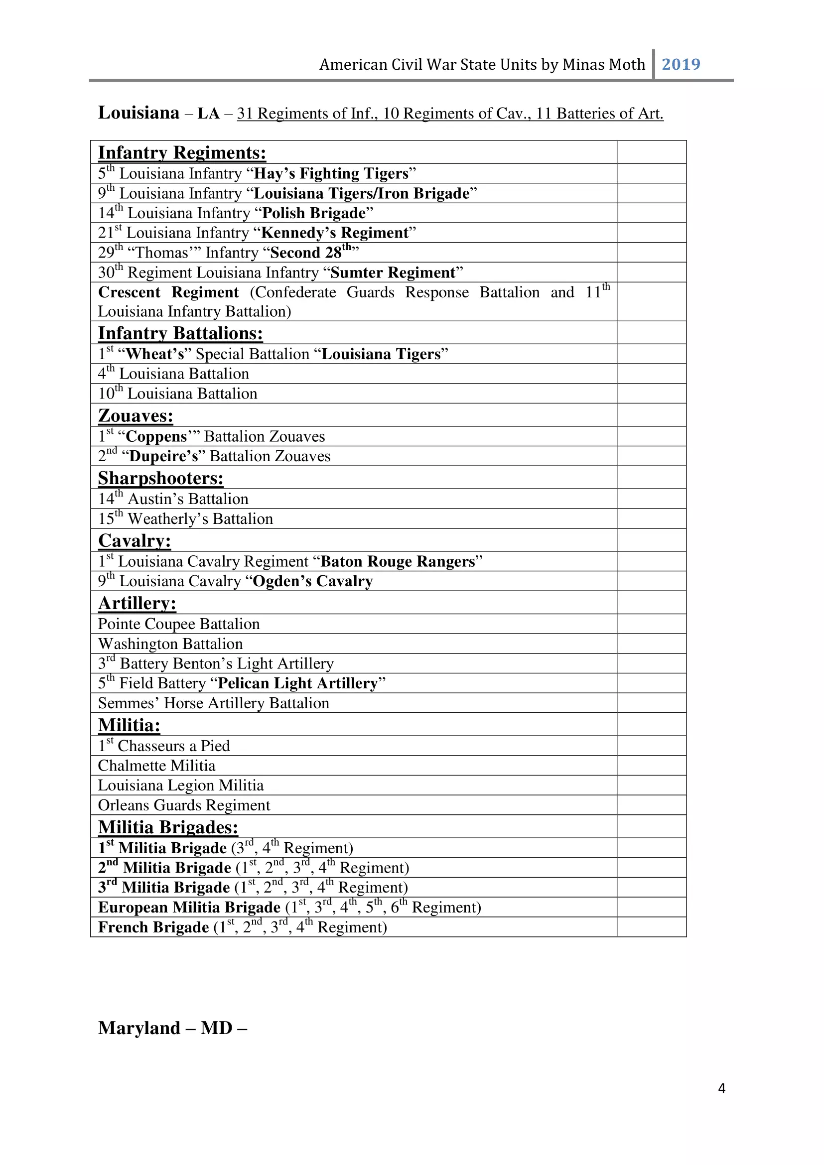 这是一份美国内战中或知名或不太为人知的团、连、营和旅的列表。其旨在供那些希望通过使用历史部队名称来获得额外沉浸感和体验的玩家使用。除部队名称外,还包含了所有南方邦联和北方联邦的州以及部分领地。 南方邦联部队 随着1860年末至1861年初战争可能性的增加,1861年2月28日,南方邦联临时国会组建了临时志愿军,并将军事指挥权授予新当选的南方邦联总统兼“总司令”杰斐逊·戴维斯。战争期间,南方邦联征召了75万至100万人。然而到1862年,北方联邦和南方邦联都被迫实施征兵制。南方联盟征召的士兵数量多于北方联邦,但具体数字同样无法确定。南方联盟的主要军队包括由罗伯特·李将军指挥的北弗吉尼亚军团和由约瑟夫·约翰斯顿将军指挥的田纳西军团。 战争期间,南方联盟的部队规模各不相同,但各单位的大致人数如下: 军团 - 24,000至28,000人 师 - 6,000至14,000人 旅 - 800至1,700人 团 - 350至400人 连 - 35至40人 这些数字与规定人数相去甚远(例如,一个团组建时本应有1,000人,分为10个连,每连100人),这是由于伤亡、疾病、逃兵等原因造成的。双方在部队兵力降至作战和有效最低人数时,都会采取部队整编措施,同时双方均会用新兵补充现有部队。 美利坚联盟国(C.S.A.)的特殊之处在于其设有上将(full General)军衔。最初,南部邦联国会将准将设为最高军衔,但随着战争的推进,其他更高的将官军衔被设立。在美利坚联盟国,仅有七人获得上将军衔,分别是塞缪尔·库珀、阿尔伯特·西德尼·约翰斯顿、罗伯特·E·李、约瑟夫·E·约翰斯顿、P·G·T·博雷加德、布拉克斯顿·布拉格和埃德蒙·柯比·史密斯。