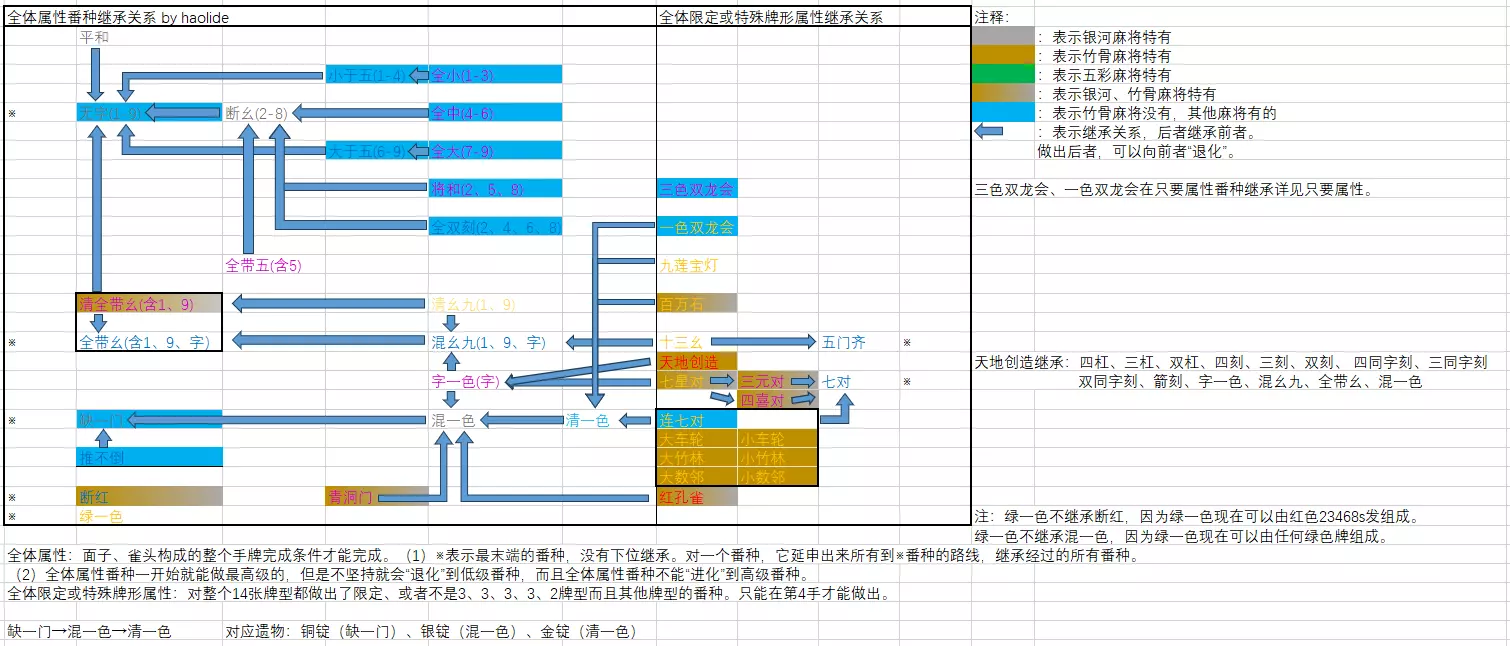 适用版本0.2.2.1-EA 《青天井》有各种各样的番种,一类番种就是一种流派。低级的番种,有时会被高级的番种替代,有时候又可以共存,被替代时就是发生了继承。 如果番种A必然包含番种B,则番种B就会被番种A继承,同时获得番种A减去番种B后额外等级对应的番数提升。 两张图带你看懂青天井各种流派和对应的继承关系。 两张图看懂番种流派和继承 麻将的番种分类较多,但在青天井中可以直接分为3类: (1)只要属性番种 只要有对应的面子和雀头,就能做出这个番种。 ※一定能在第4次出牌后激活。 ※可以在已经打出的牌型基础上,向上“进化”到高级番种,并且不会“退化”。又可以分类成:字牌、数牌、刻杠、花牌