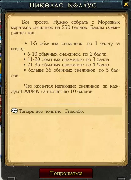 这张截图展示了雪花的奖励。不建议收集超过21个,因为这相当困难,每次计时器的最大时间都会减少。收集到21个后提交,然后循环往复,不要急于一次性完成所有事情。记住,蚂蚁是你积分的主要来源。当你额外收集到250点雪花时,不要忘记提交任务并再次接取,这个任务和击杀格罗林以及收集伊涅亚一样是可以重复的。