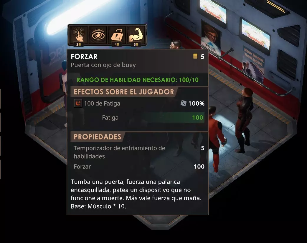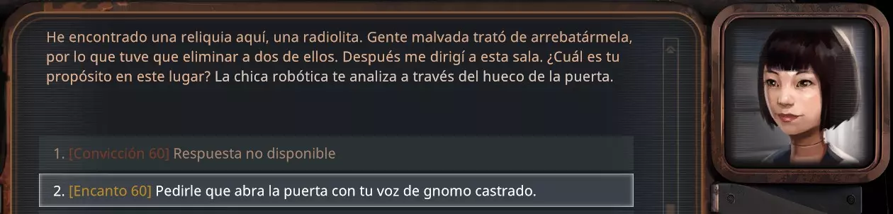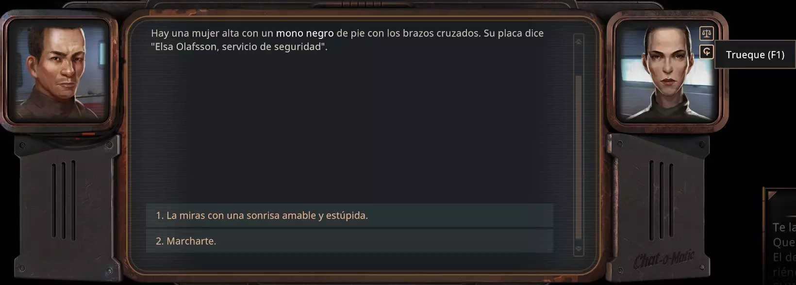 你可以使用30点【撬锁】技能(需要撬锁工具)来打开这扇门,而不是使用10点力量值,如果你想的话。 和人们交谈,你可以获得更多关于自身处境的信息。另外,你可能不知道,你还可以和他们进行交易。点击他们肖像上的天平图标,或者按键盘上的F1键即可。