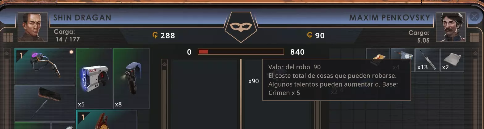 在这个例子中,我只能偷总价值为840的东西。 请注意,每个游戏中你只能对一个NPC进行一次偷窃! 所以一定要偷他身上最好的东西,并且使用能提高你【犯罪】属性的物品来最大化偷窃收益。 偷窃并非100%成功,一旦偷完东西,你必须立即离开那里,受害者几乎会立刻发现并开始寻找小偷,如果你被看到,就会被怪罪!但不要脱离潜行状态! 你可以通过面具图标从白色变为灰色来判断还有多少时间会被发现,当它完全变成灰色时,你就会被发现!这种情况通常会持续1到2个游戏小时,你可以去别的地方等风波平息,或者切换区域并使用时钟来缩短等待时间。如果盗窃成功,你会获得偷到的东西;如果失败,你将一无所获。 一旦你偷到了一些东西,要注意需要过一段时间才能出售它们。把鼠标放在偷来的物品上,会显示风波何时平息。 游戏中有一个成就要求在完成康科迪亚任务前收集1500美元,所以我开始尽可能地偷东西。如果你不想偷窃,也可以在浴室里和穿橙色衣服的人打赌。