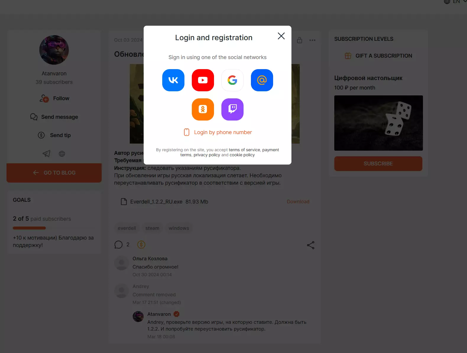 需要拥有Boosty账户,或者可以使用其他账户登录。