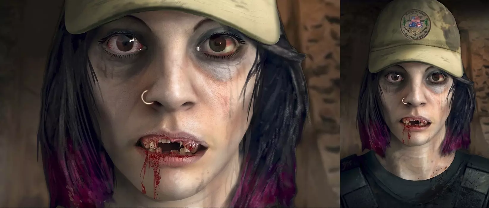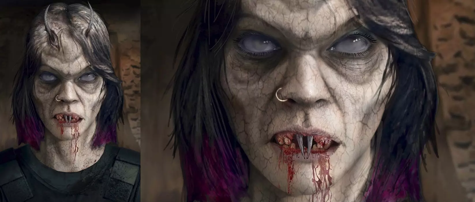 最终阶段:皮肤惨白,双目无神,前齿变为长长的獠牙,长有犄角 运作原理 寄生虫必须寻找死亡或活着的生物作为宿主。通常寄生在其他生物体内,但也能独立生存。进入宿主后,会缓慢使其死亡,直至彻底死亡。之后会复活宿主的身体,并完全控制它。所有宿主都通过拔掉前门牙并换上獠牙来实现联合。就人类而言,会出现角,皮肤变得苍白,眼睛也会发生变化。寄生虫以宿主血液中的肾上腺素为食,因此在发动攻击前必须让宿主极度恐惧,这样“盛宴”才会更加“美味”。