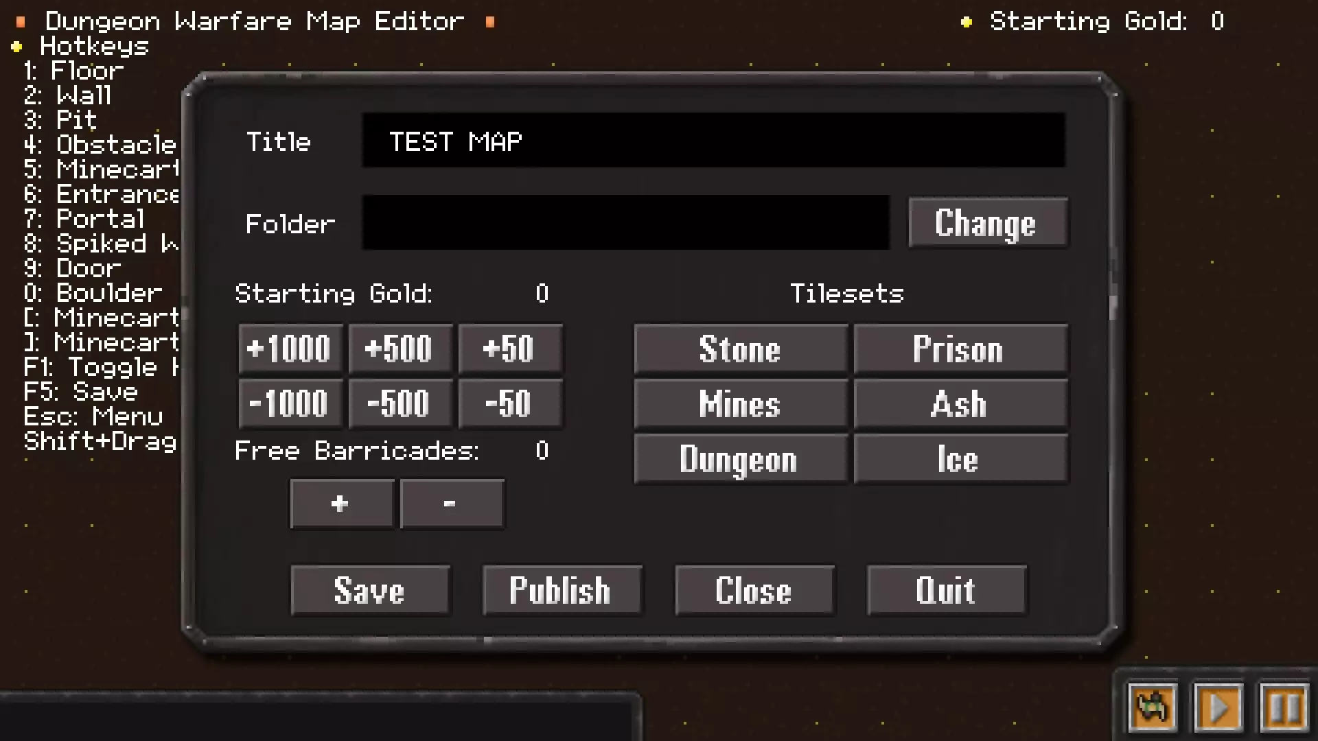 标题为地图名称 文件夹为之前保存的地图名称 更改是修改现有地图名称 左边可以修改黄金数量 免费路障:暂时不清楚其功能 右边可以修改地图类型 石块类、监狱类、矿山类、灰烬类、地牢类、冰雪类 保存、发布地图、关闭、离开 点击右下角最左边的【行走的小人】按键打开制怪界面 添加波数:可上下移动删除 添加敌人