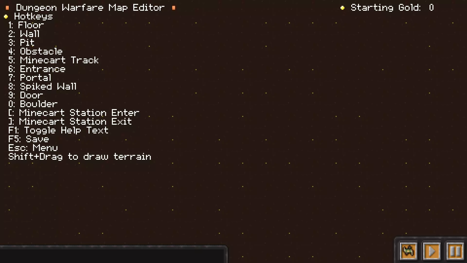左上角是各种按键的功能说明:按空格可以调整角度。 1是填充一条路,可理解为清空一个方块。 2是建造一面墙壁,可理解为生成一个方块。 3是深坑,在雪地ICE环境下会变成水,在灰烬Ash环境下会变成岩浆。 4是装饰物,包括石头和骷髅头。 5是类似我的世界的铁轨,用于控制矿车的行驶路径。 6是怪物刷新区域,即刷怪口。 7是守护口,即怪物进攻区域。 8是带刺的墙壁。 9是木门。 0是巨石。 [是矿车入口。 ]是矿车出口。 F1是隐藏帮助列表。 F5是保存。 ESC是菜单。 菜单界面布局和制怪界面布局。