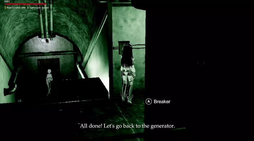 攻略 - 学校探索与闪回 墓地场景结束后,你将再次扮演由美,与弗兰金一同出现在学校前。与他们交谈后,绕到学校右侧,从门卫室的门进入。进入后,走向前方的门以及左侧的玩偶。穿过门后,你会看到一段楼梯。上楼并穿过另一扇门。一个玩偶会出现在你身后,但继续向前进入下一扇门和走廊。走下楼梯,会进入另一个房间,里面还有一段楼梯。 楼梯上方右侧是一扇锁着的门,左侧则是更多楼梯。向左走并上楼,来到另一组门前。左侧的门会砰地关上,但右侧有一个门口,里面有发电机。与发电机互动,它会提示你打开五个断路器。第一个断路器就在发电机房外。