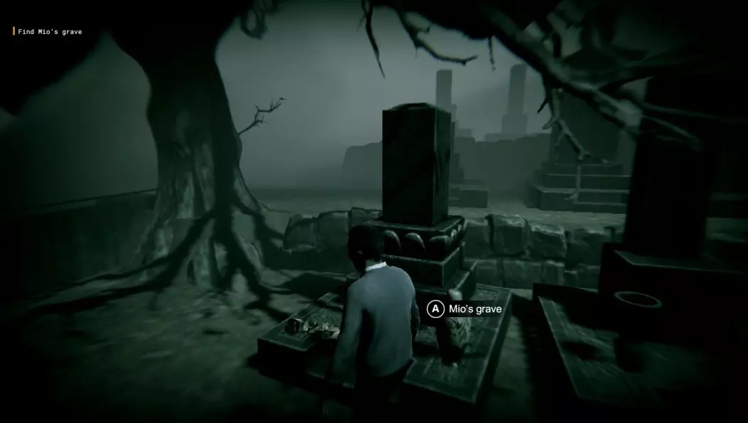 攻略 - 美绪的坟墓 作为美绪的父亲来到墓地,你的目标是找到美绪的坟墓。沿着前方的小路直走,美绪的鬼魂会出现在你面前。从她身边走过,直到你到达一个岔路口。美绪会再次出现,从她身边向右走,然后上一段楼梯。 美绪的坟墓在最左边,是唯一一个顶部有装饰的坟墓。与坟墓互动,开始和美绪的剧情。剧情结束后,走下楼梯,继续直走离开墓地。