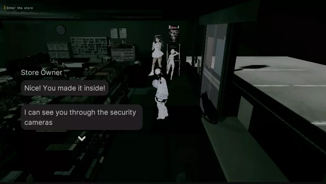当你第一次走向柜台,镜头角度改变时,会有一个玩偶挡在路上。走向商店后方来改变镜头角度,然后回到柜台。此时玩偶会移动位置,你需要绕过它走到柜台后面。到达柜台后面后,走向收银机并按下按钮将其打开。