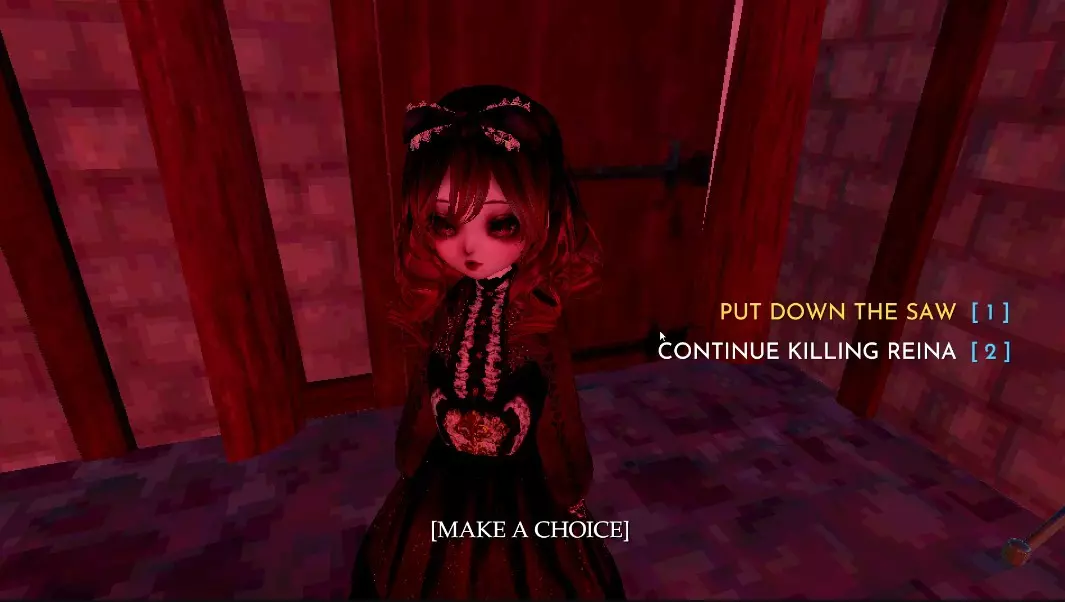 选择【放下锯子】将解锁Guardian Angel成就。选择【继续杀死Reina】将解锁Call Me the Devil成就。做出选择后,游戏将回到由美视角,你会再次抵达玩偶镇。径直向前走,与Frangin进行最后一次会面。