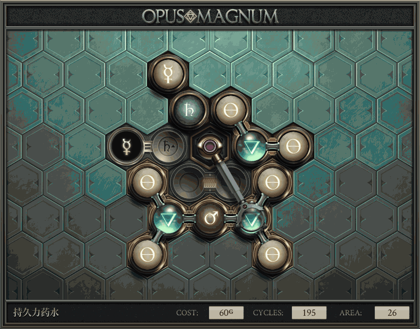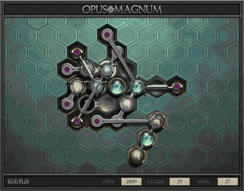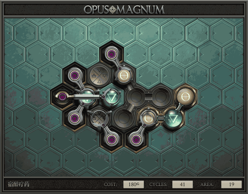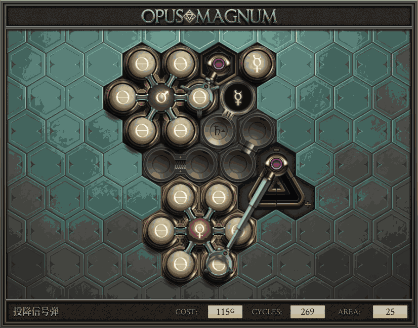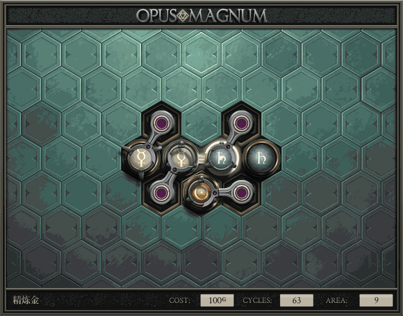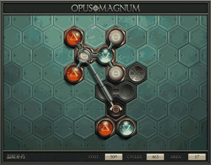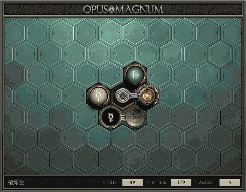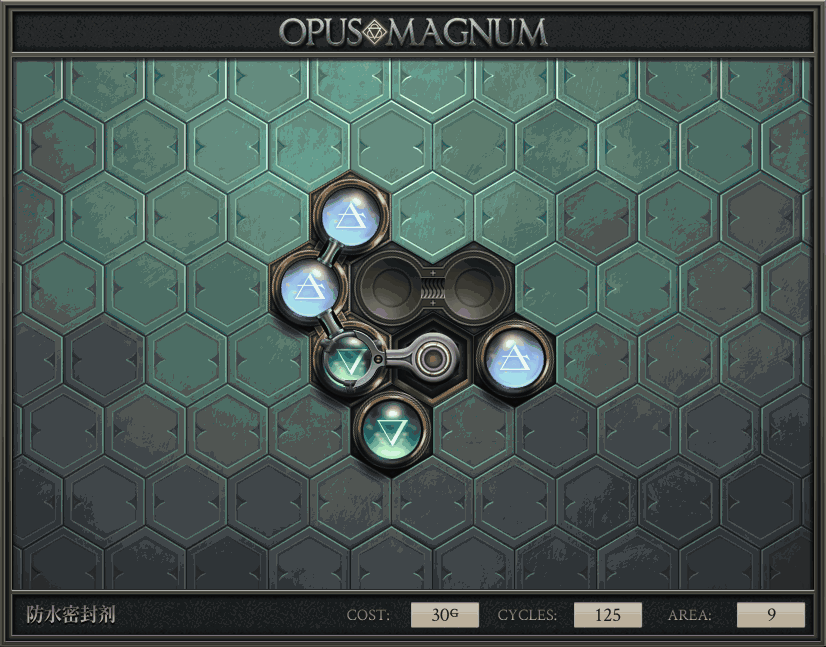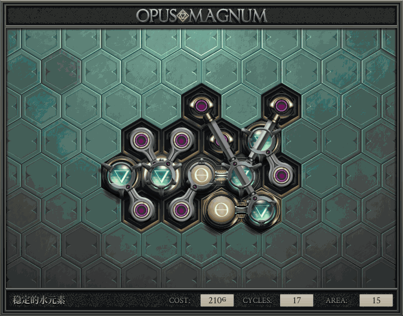 不过没办法,我会回来把它更完的,某天。仍然欢迎留言讨论解法!本篇指南将为每道谜题提供至少一种解法(部分谜题会附带吐槽),并且会在优化过程中持续更新。解法分为三种:便宜(C)、迅捷(Q)和干净(N)(从字面意思理解即可),分别对应游戏中的三种衡量指标:成本(COST)、周期(CYCLE)、面积(AREA)。在优化解法时,我比较倾向于专注优化其中一项指标,但有时单个解法也能达成多个成就。 零.介绍 《opus magnum》与zach以往的游戏相比,最明显的特点是几乎每关都有一个非常明显可达到的理论最优解。这让我们的优化过程变得比较愉快。下面以教学关为例,看看如何抵达最优解。 与zachtroincs以往的游戏相比,《opus magnum》的每关在【便宜】【简洁】【快速】这三个指标上都存在理论最优解,这使得优化过程成为一种“愉快”的体验。这里以教学关为例进行说明。 【便宜】:基本上所有谜题都能用一个操作臂解决。普通操作臂不行就用活塞臂,还不行就用轨道。所以最便宜的解法就是只用一个操作臂的解法(如果必须用到活塞臂或轨道,则可能需要多斟酌一下)。基本上,每个谜题都能用单个机械臂解决,如果不行,就用活塞,如果还是不行,那就考虑添加一些轨道。所以找到最廉价的解决方案就是想办法只用一个机械臂来解决(如果需要轨道,你可能需要再思考一下)。 干净 NEAT:下方没有垫东西时不要旋转枢轴,多用活塞,尽量紧凑排列组件,不要让机械臂空挥。 尽量不要在下方是空单元格时使用枢轴,多使用活塞,将组件排列得尽可能紧凑,尽量不要让机械臂在空单元格上方旋转。 迅捷 QUICK:要弄清楚一件事,从输入端口取出元素的最大速率是每2刻度一个,这需要2个机械臂,把所有过程全部分拆,一个机械臂只做一件事:抓取、做事、复位。这样一来所有机械臂全部是4TICK的周期,大多数情况下可以得到最速解。 只需知道一件事,从输入口提取元素的最大速度是每2TICK一个。所以你需要解决这个流程,让一个机械臂只做一件事:抓取、执行操作、复位。这样所有机械臂就都有一个4TICK的循环,在大多数情况下你能得到最快的解决方案。 一.帝国大学 1.稳定的水元素