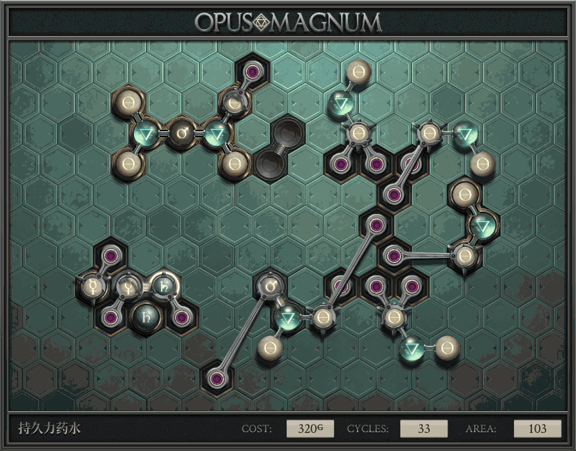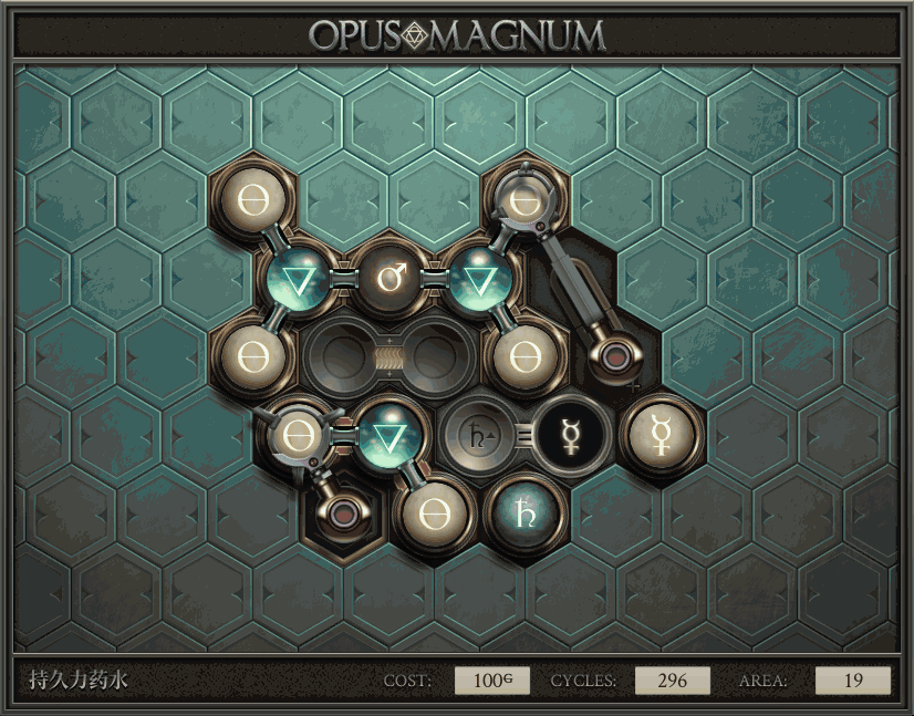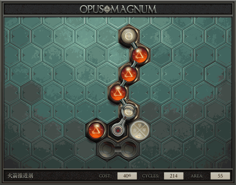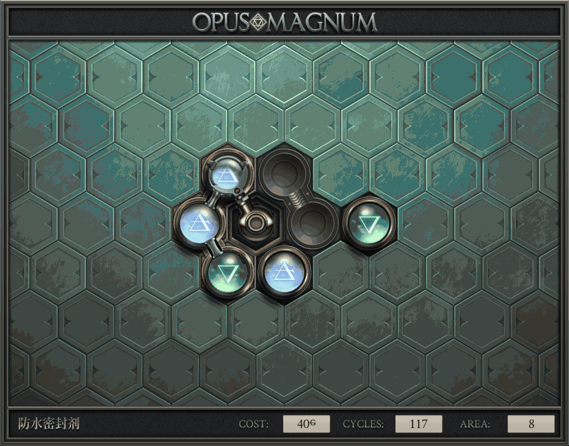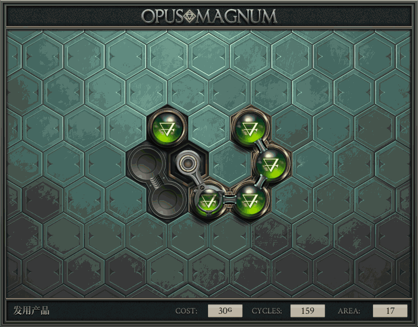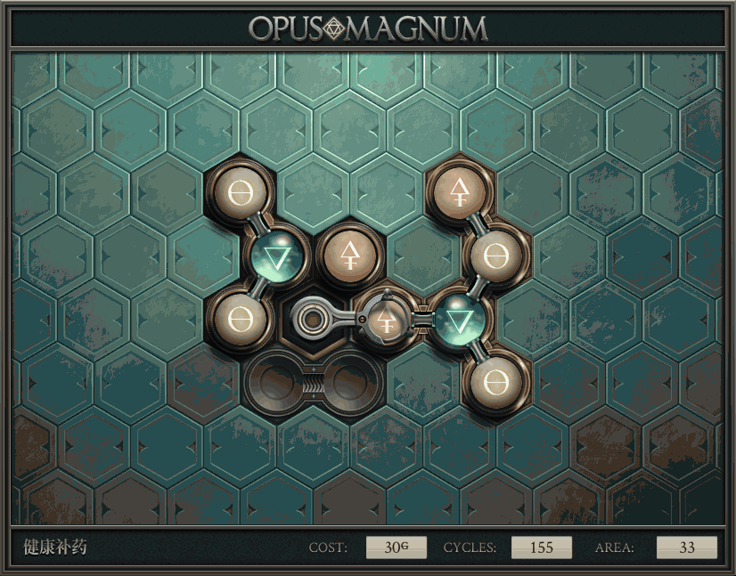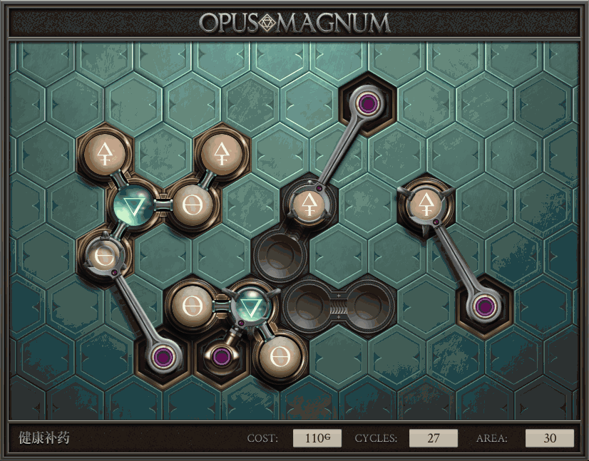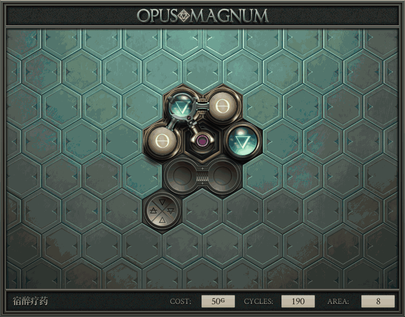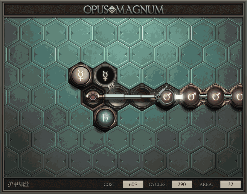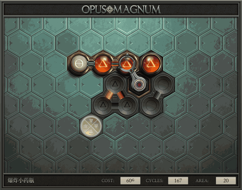 不过没办法,我会回来把它更完的,某天。仍然欢迎留言讨论解法!本篇指南将为每道谜题提供至少一种解法(部分谜题会附带吐槽),并且会在优化过程中持续更新。解法分为三种:便宜(C)、迅捷(Q)和干净(N)(从字面意思理解即可),分别对应游戏中的三种衡量指标:成本(COST)、周期(CYCLE)、面积(AREA)。在优化解法时,我比较倾向于专注优化其中一项指标,但有时单个解法也能达成多个成就。 零.介绍 《opus magnum》与zach以往的游戏相比,最明显的特点是几乎每关都有一个非常明显可达到的理论最优解。这让我们的优化过程变得比较愉快。下面以教学关为例,看看如何抵达最优解。 与zachtroincs以往的游戏相比,《opus magnum》的每关在【便宜】【简洁】【快速】这三个指标上都存在理论最优解,这使得优化过程成为一种“愉快”的体验。这里以教学关为例进行说明。 【便宜】:基本上所有谜题都能用一个操作臂解决。普通操作臂不行就用活塞臂,还不行就用轨道。所以最便宜的解法就是只用一个操作臂的解法(如果必须用到活塞臂或轨道,则可能需要多斟酌一下)。基本上,每个谜题都能用单个机械臂解决,如果不行,就用活塞,如果还是不行,那就考虑添加一些轨道。所以找到最廉价的解决方案就是想办法只用一个机械臂来解决(如果需要轨道,你可能需要再思考一下)。 干净 NEAT:下方没有垫东西时不要旋转枢轴,多用活塞,尽量紧凑排列组件,不要让机械臂空挥。 尽量不要在下方是空单元格时使用枢轴,多使用活塞,将组件排列得尽可能紧凑,尽量不要让机械臂在空单元格上方旋转。 迅捷 QUICK:要弄清楚一件事,从输入端口取出元素的最大速率是每2刻度一个,这需要2个机械臂,把所有过程全部分拆,一个机械臂只做一件事:抓取、做事、复位。这样一来所有机械臂全部是4TICK的周期,大多数情况下可以得到最速解。 只需知道一件事,从输入口提取元素的最大速度是每2TICK一个。所以你需要解决这个流程,让一个机械臂只做一件事:抓取、执行操作、复位。这样所有机械臂就都有一个4TICK的循环,在大多数情况下你能得到最快的解决方案。 一.帝国大学 1.稳定的水元素