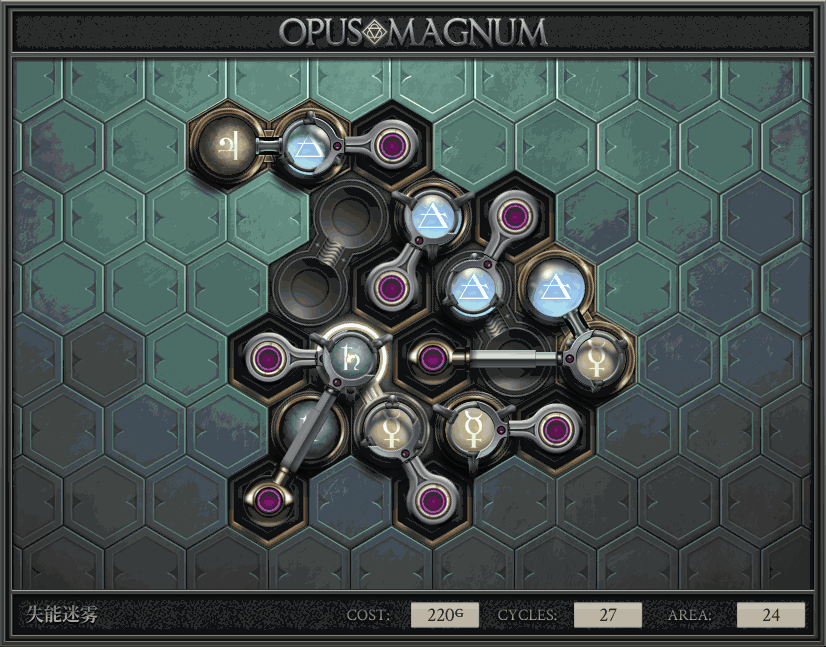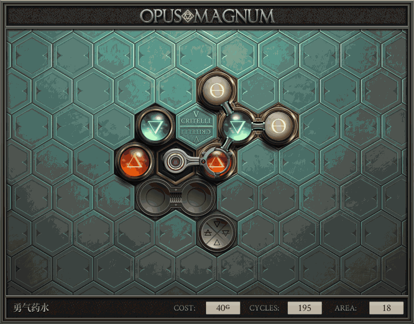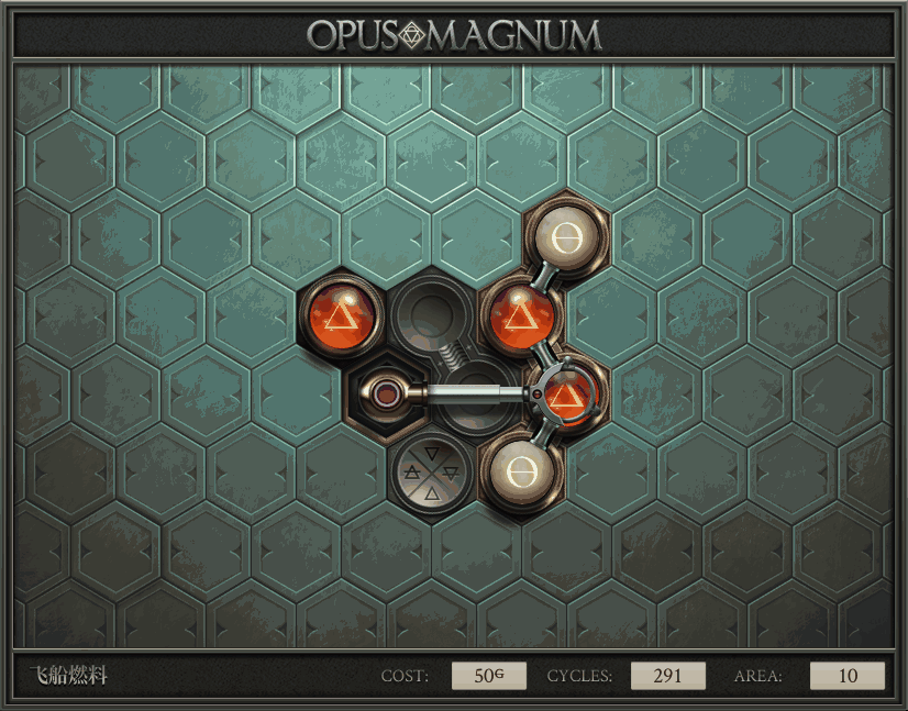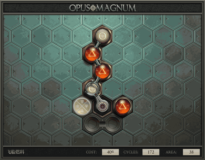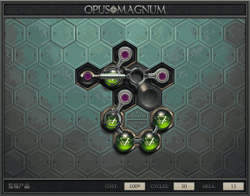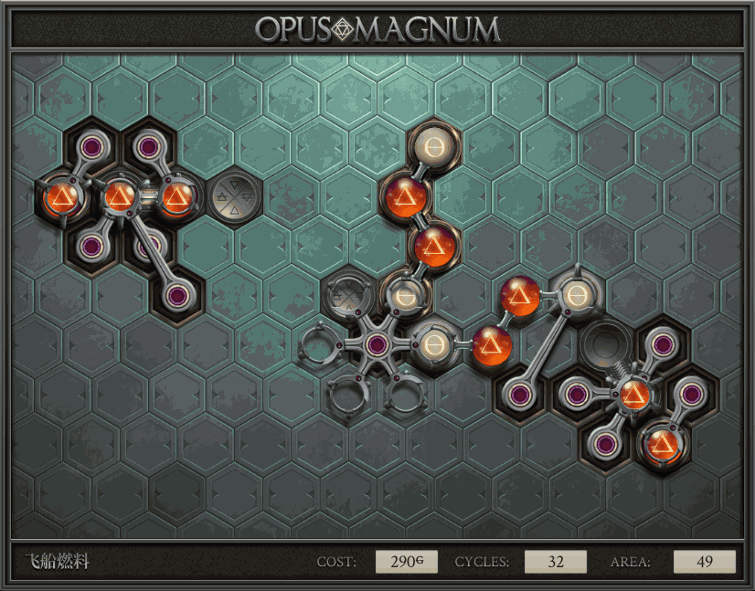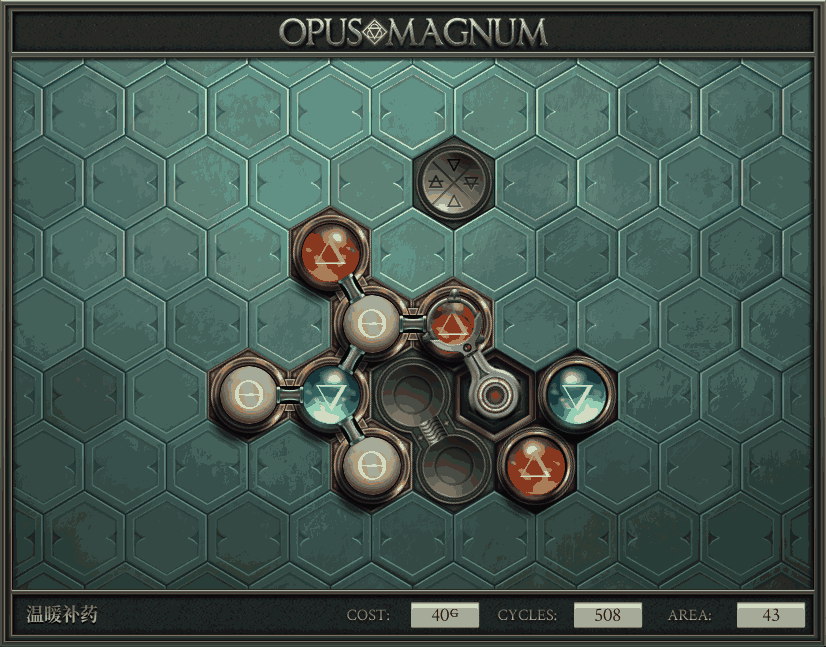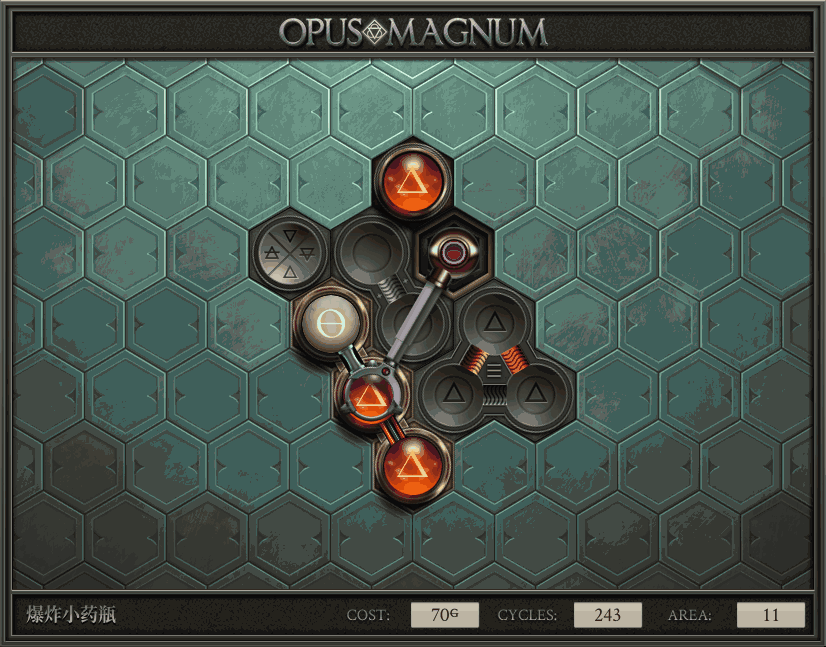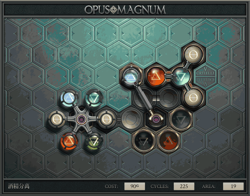 不过没办法,我会回来把它更完的,某天。仍然欢迎留言讨论解法!本篇指南将为每道谜题提供至少一种解法(部分谜题会附带吐槽),并且会在优化过程中持续更新。解法分为三种:便宜(C)、迅捷(Q)和干净(N)(从字面意思理解即可),分别对应游戏中的三种衡量指标:成本(COST)、周期(CYCLE)、面积(AREA)。在优化解法时,我比较倾向于专注优化其中一项指标,但有时单个解法也能达成多个成就。 零.介绍 《opus magnum》与zach以往的游戏相比,最明显的特点是几乎每关都有一个非常明显可达到的理论最优解。这让我们的优化过程变得比较愉快。下面以教学关为例,看看如何抵达最优解。 与zachtroincs以往的游戏相比,《opus magnum》的每关在【便宜】【简洁】【快速】这三个指标上都存在理论最优解,这使得优化过程成为一种“愉快”的体验。这里以教学关为例进行说明。 【便宜】:基本上所有谜题都能用一个操作臂解决。普通操作臂不行就用活塞臂,还不行就用轨道。所以最便宜的解法就是只用一个操作臂的解法(如果必须用到活塞臂或轨道,则可能需要多斟酌一下)。基本上,每个谜题都能用单个机械臂解决,如果不行,就用活塞,如果还是不行,那就考虑添加一些轨道。所以找到最廉价的解决方案就是想办法只用一个机械臂来解决(如果需要轨道,你可能需要再思考一下)。 干净 NEAT:下方没有垫东西时不要旋转枢轴,多用活塞,尽量紧凑排列组件,不要让机械臂空挥。 尽量不要在下方是空单元格时使用枢轴,多使用活塞,将组件排列得尽可能紧凑,尽量不要让机械臂在空单元格上方旋转。 迅捷 QUICK:要弄清楚一件事,从输入端口取出元素的最大速率是每2刻度一个,这需要2个机械臂,把所有过程全部分拆,一个机械臂只做一件事:抓取、做事、复位。这样一来所有机械臂全部是4TICK的周期,大多数情况下可以得到最速解。 只需知道一件事,从输入口提取元素的最大速度是每2TICK一个。所以你需要解决这个流程,让一个机械臂只做一件事:抓取、执行操作、复位。这样所有机械臂就都有一个4TICK的循环,在大多数情况下你能得到最快的解决方案。 一.帝国大学 1.稳定的水元素